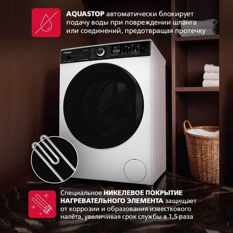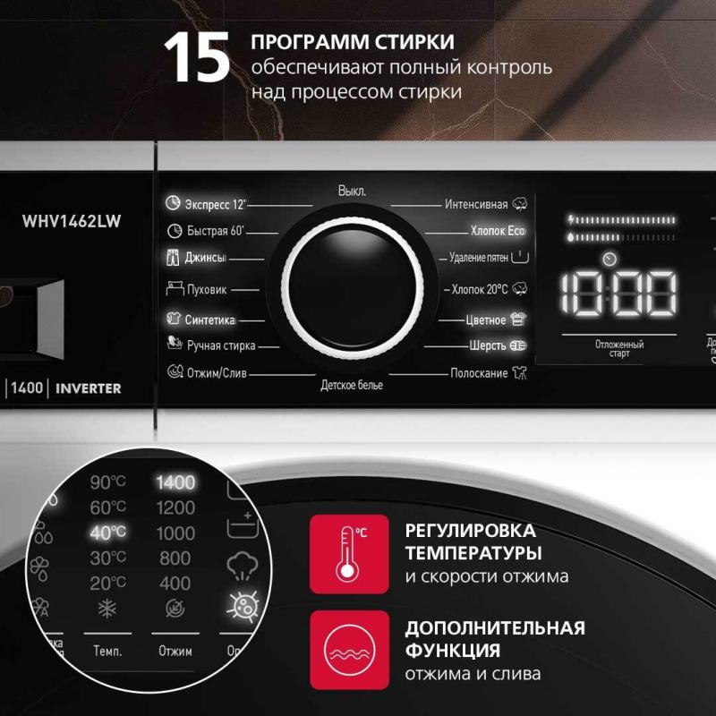 Стиральная машина Hansa WHV1462LW имеет максимальную загрузку белья 10,5 кг. Скорость отжима составляет 1400 об/мин. Устройство поддерживает 15 программ стирки, включая быструю стирку, экспресс цикл на 12 или 15 минут, режим для детской одежды и функцию удаления пятен. Доступны опции пауза, отсрочка старта, самодиагностика неисправностей и обработка паром. Предусмотрена блокировка управления. Модель оснащена инверторным мотором. Панель управления сенсорная с дисплеем. Класс энергопотребления А++.