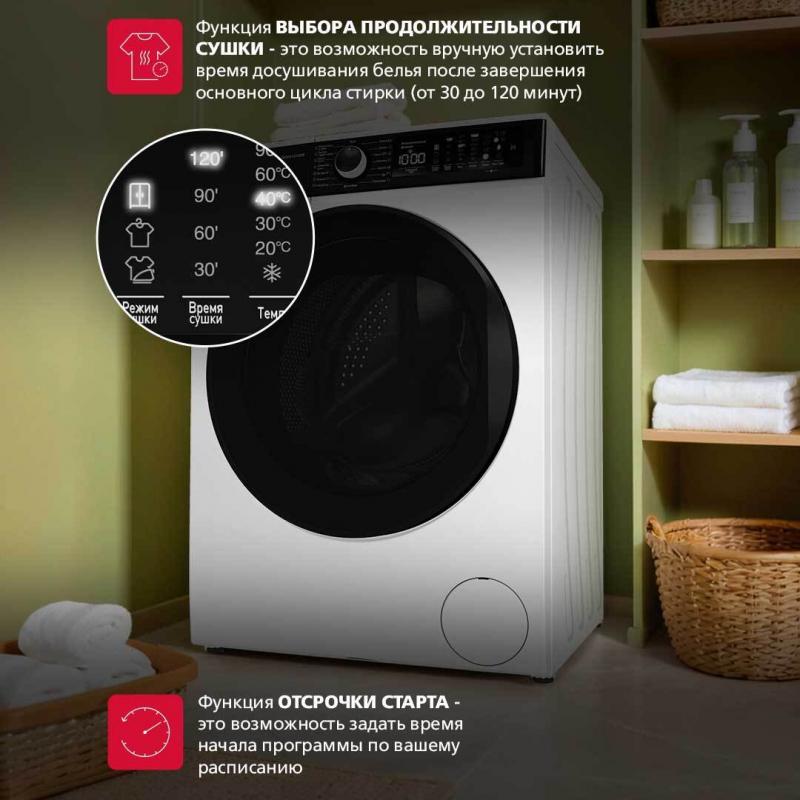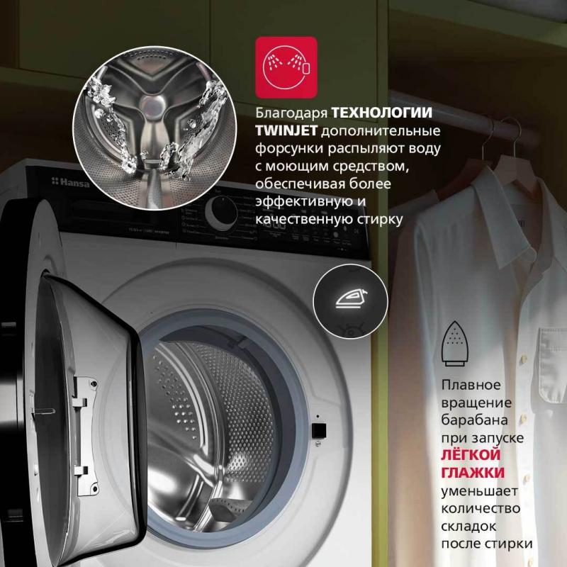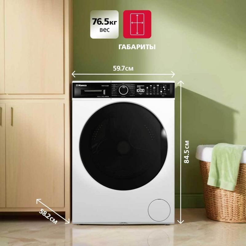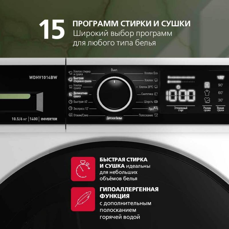 Стирально-сушильная машина Hansa WDHV1014BW имеет загрузку 6 кг для стирки и 4 кг для сушки. Скорость отжима составляет 1400 об/мин. Количество программ — 15, среди которых стирка хлопка, синтетики, шерсти, пуховых вещей и экспресс-цикл на 12 минут. Доступны функции пара, легкой глажки, дополнительного полоскания, предварительной стирки и комбинированного цикла стирки с сушкой за один час. Модель оснащена инверторным мотором и электронным типом управления с дисплеем. Реализованы опции отсрочки старта, паузы, регулировки температуры и скорости вращения барабана. Система включает контроль перелива воды, пенообразования, дисбаланса и самодиагностику неисправностей. Имеется звуковая индикация окончания работы и блокировка панели управления. Вес устройства без упаковки составляет 76,5 кг.