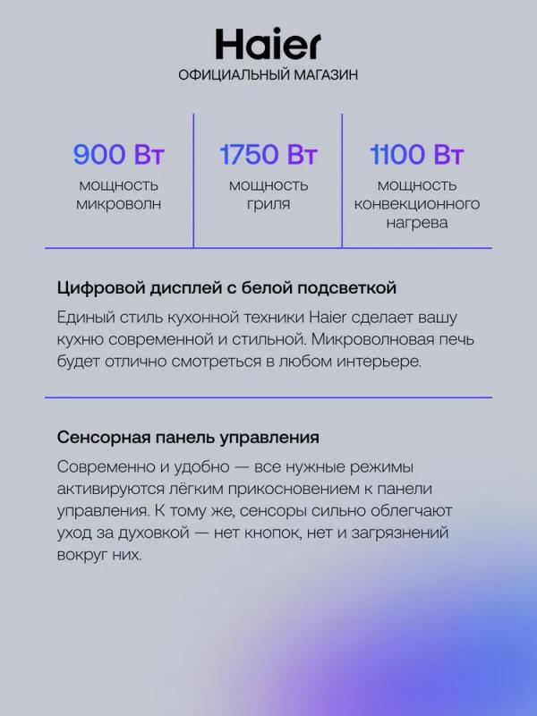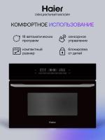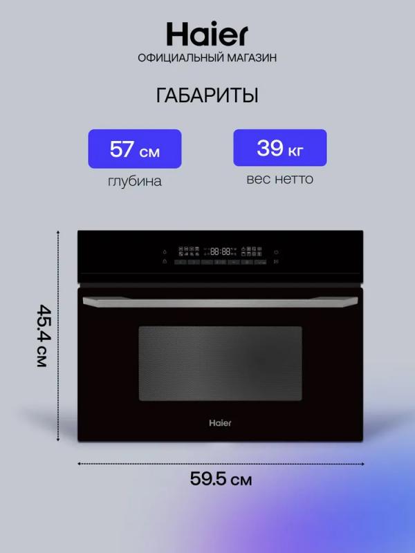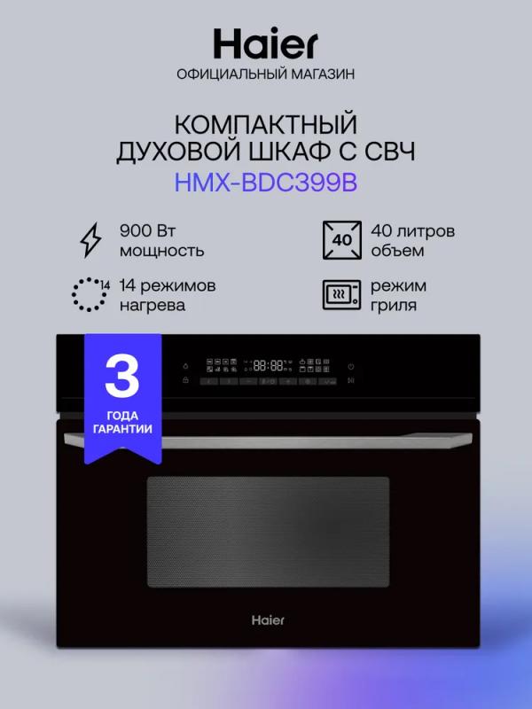 Встраиваемая микроволновая печь HAIER HMX-BDC399B имеет объем 40 литров и мощность микроволн 900 Вт. Управление сенсорное с возможностью регулировки мощности. Дверца открывается сверху вниз с помощью ручки. Внутреннее покрытие камеры выполнено из эмали. Модель оснащена автоматической разморозкой, автоматическим разогревом, режимами гриль, конвекция, гриль+конвекция и микроволны+конвекция. Мощность гриля составляет 1750 Вт. На корпусе расположен дисплей. Имеется блокировка от детей и таймер на отключение до 1440 минут. В комплект входит решетка для гриля. Цвет корпуса черный, длина кабеля питания 1 метр. Габариты прибора 59.5х45.5х57 см, размеры ниши для встраивания 56.4х45.5х56 см. Вес устройства 39 кг.