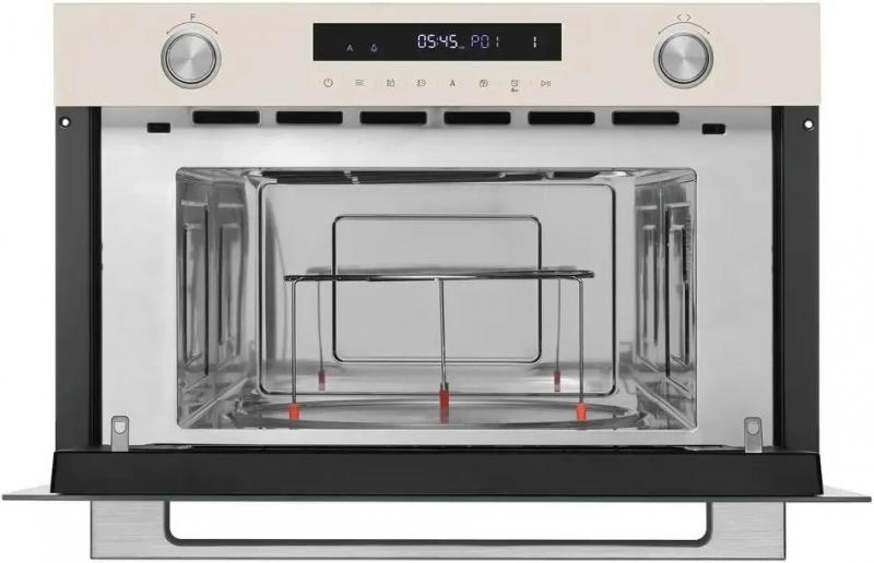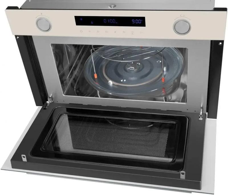 Микроволновая печь MAUNFELD MBMO349GBG имеет объем 34 литра и мощность микроволн 900 Вт. Управление комбинированное, с возможностью регулировки мощности на пяти уровнях. Оснащена звуковым сигналом окончания приготовления и дисплеем с часами. Дверца открывается сверху вниз с помощью ручки. Внутренняя камера из нержавеющей стали диаметром 345 мм содержит поворотный стол и включает освещение. Предусмотрено 8 программ и различные режимы: автоматическая разморозка, разогрев, приготовление, гриль. Гриль тэнового типа с мощностью 1100 Вт. Есть функции блокировки от детей и задержки пуска. Таймер отключения настраивается до 90 минут. Комплектуется решеткой для гриля. Цвет корпуса бежевый. Длина кабеля питания составляет 1 метр. Размеры (ШхВхГ): 59.5 х 38.2 х 45.8 см, размеры ниши (ШхВхГ): 56 х 38 х 55 см. Вес 23.05 кг.