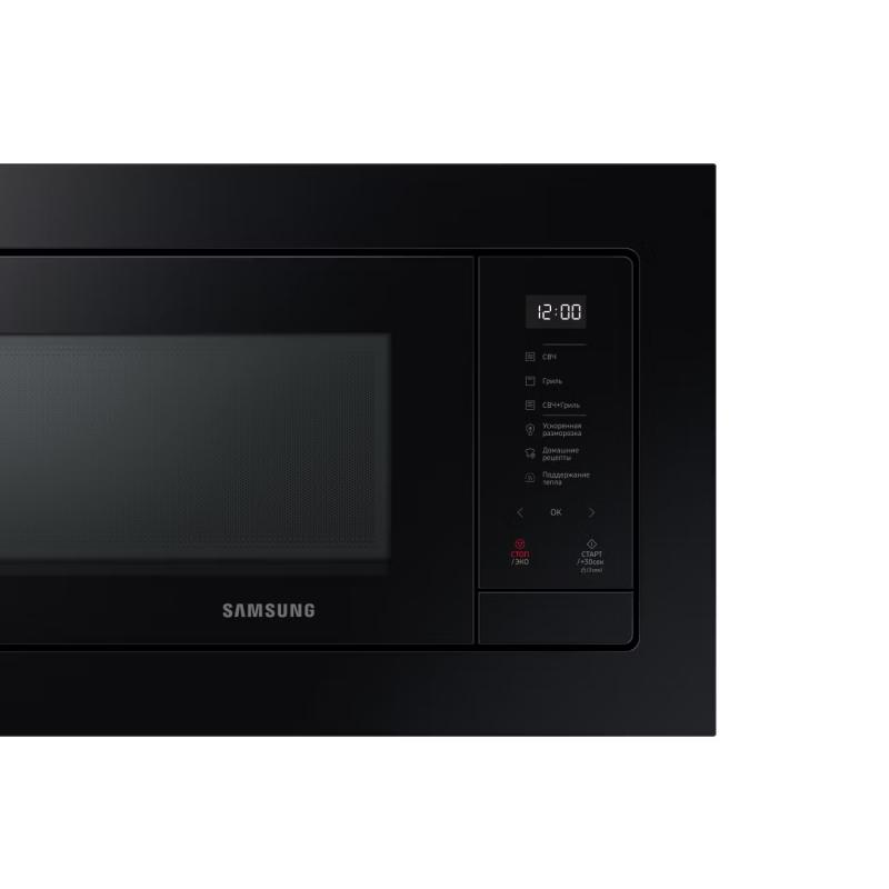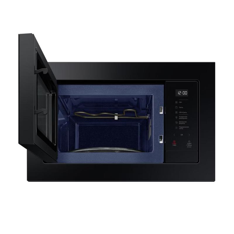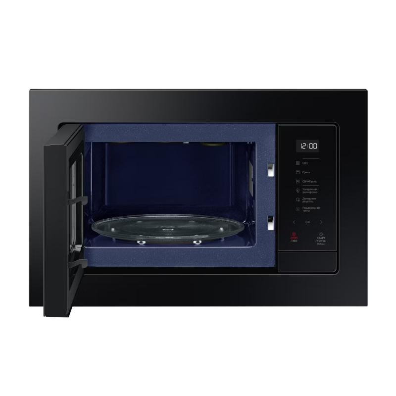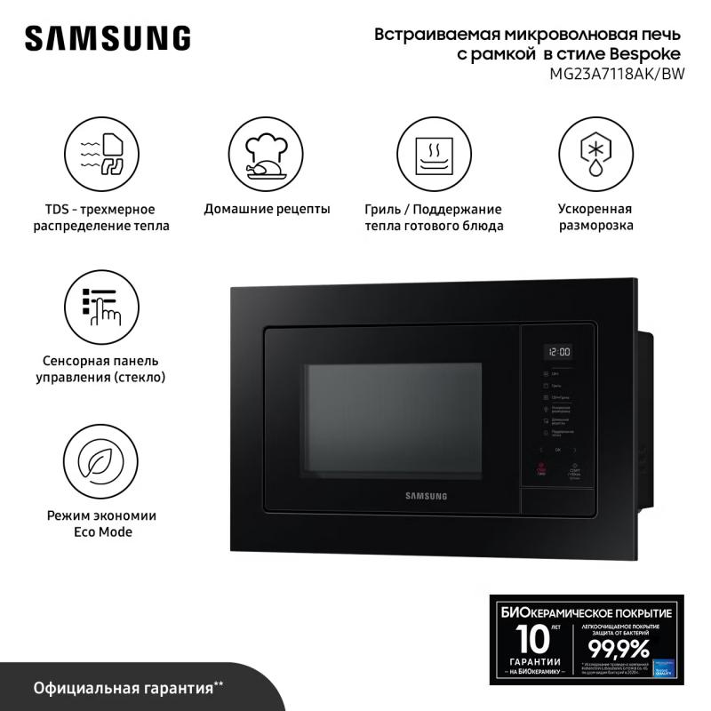 Встраиваемая микроволновая печь Samsung MG23A7118AK/BW черного цвета оснащена сенсорным управлением и цифровым дисплеем. Модель включает 6 уровней мощности, функцию размораживания по весу, режимы микроволн, гриль и комбинированный. Мощность микроволн составляет 800 Вт, гриля - 1100 Вт. Имеет биокерамическое покрытие, поворотный стол из стекла диаметром 28.8 см и ТЭН-гриль. Объем камеры 23 литра. Предусмотрены встроенные часы, подсветка, звуковой сигнал с возможностью отключения и защита от детей. Потребляемая мощность 2400 Вт, есть режим энергосбережения. В комплект входят металлическая решетка, низкая решетка для гриля и рамка для встраивания. Габариты прибора 275х489х362 мм, вес 14.5 кг.
