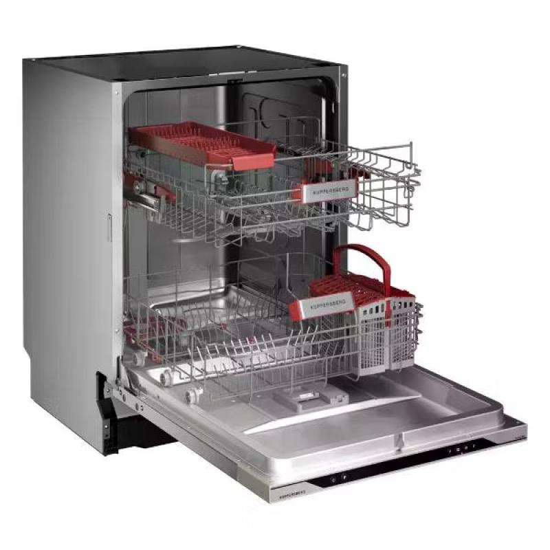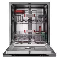 Две корзины с регулировкой по высоте, средняя имеет 2 положения. Три разбрызгивателя, вертикальная корзина для столовых приборов, полка для чашек, складные держатели тарелок. Автоматическое открывание двери после завершения цикла. LED-подсветка камеры из нержавеющей стали.