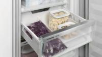 Встраиваемый холодильник Liebherr ICNd 5603 Pure NoFrost имеет нижнее расположение морозильной камеры и оснащен системой No Frost в морозильном отделении. Управление сенсорное с ЖК-дисплеем расположен внутри. Полезный объем составляет 285 л, из них 215 л приходится на холодильную камеру и 70 л на морозильную. В холодильном отделении установлено 5 стеклянных полок и 4 пластиковых дверных балкона, предусмотрен ящик для овощей и фруктов. Морозильная камера содержит 3 отделения и имеет мощность замораживания 6 кг/сутки. Среди функций доступны суперзаморозка, суперохлаждение, ECO режим, режим отпуска, блокировка от детей и сигнал открытой двери. Антибактериальный фильтр обеспечивает защиту от микробов. Климатический класс SN/N/ST/T позволяет эксплуатацию в разных условиях. Годовой расход электроэнергии составляет 180 кВт·ч, уровень шума 33 дБ. Двери перенавешиваемые, крепление мебельного фасада жесткое. Размеры ниши для встраивания: высота 194-195 см, ширина 56 (57) см, глубина 55 см. Габариты прибора: высота 193.8 см, ширина 55.9 см, глубина 54.6 см, вес 64.3 кг.
