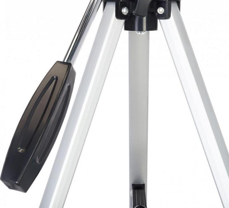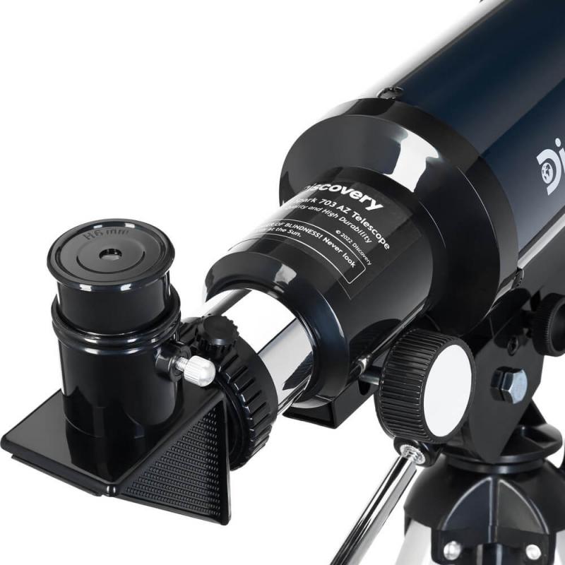 Телескоп Levenhuk Discovery Spark 703 AZ выполнен по схеме ахроматического рефрактора с азимутальной монтировкой. Объектив имеет диаметр 70 мм и фокусное расстояние 300 мм. Относительное отверстие составляет f/10. Максимальное полезное увеличение достигает 140х. Оптика изготовлена из оптического стекла с антибликовым покрытием. Разрешающая способность — 4 угловых секунд. Проницающая способность составляет приблизительно 11.33 звездной величины. Посадочный диаметр окуляров — 0.965 дюйм. Фокусировка осуществляется с помощью реечного фокусера. Управление телескопом ручное с удобной ручкой наведения. В комплектацию входят окуляры H6 мм, H20 мм, оборачивающий окуляр 1.5x, линза Барлоу 3x и диагональное зеркало 90°. Тренога настольная алюминиевая высотой 350 мм. Труба выполнена из металла. Вес: 2.1 кг.