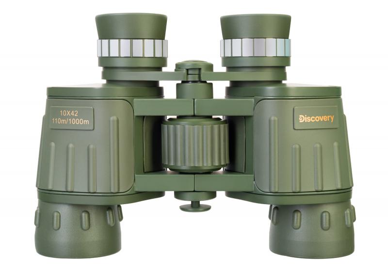 Levenhuk Discovery Field 10x42 — бинокль с оптической системой, основанной на Porro-призмах и линзах из стекла BK-7. Увеличение составляет 10 крат, диаметр объектива — 42 мм. Диаметр выходного зрачка — 4.2 мм, вынос выходного зрачка — 19 мм. Реальный угол зрения — 6.5°, поле зрения на расстоянии 1000 м — 110 м. Минимальная дистанция фокусировки — 10 м. Межзрачковое расстояние регулируется в диапазоне 54–74 мм. Фокусировка осуществляется центральным барабаном. На правом окуляре расположено кольцо для коррекции диоптрий (±4 D). Наглазники окуляров выполнены из резины. Оптика имеет полное многослойное просветление. Корпус выполнен из пластика, покрыт резиной. Размер упаковки: 20×17×8 см. Вес в упаковке: 0.94 кг.