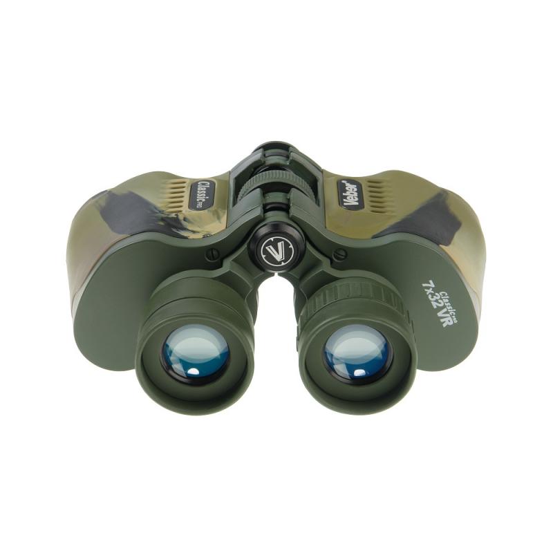 Veber Classic PRO 7x32 VR — бинокль с Porro-призмами из стекла BaK-4 и многослойным просветлением FMC. Увеличение — 7 крат. Диаметр объектива — 32 мм. Поле зрения на расстоянии 1000 м — 130 м. Диаметр выходного зрачка — 4.5 мм. Сумеречное число — 15. Центральная фокусировка осуществляется рифленым металлическим колесом. Межзрачковое расстояние регулируется в диапазоне 56–73 мм. Правый окуляр имеет диоптрийную коррекцию ±4D. Корпус пластиковый с резиновой оболочкой камуфляжной расцветки. Ответственные подвижные детали выполнены из металла. Предусмотрена резьба 1/4 дюйма для установки на штатив. Брызгозащитное исполнение. Рабочий температурный диапазон: от -12°С до +45°С. Размеры упаковки: 185х150х80 мм. Вес: 730 г.
