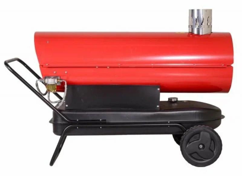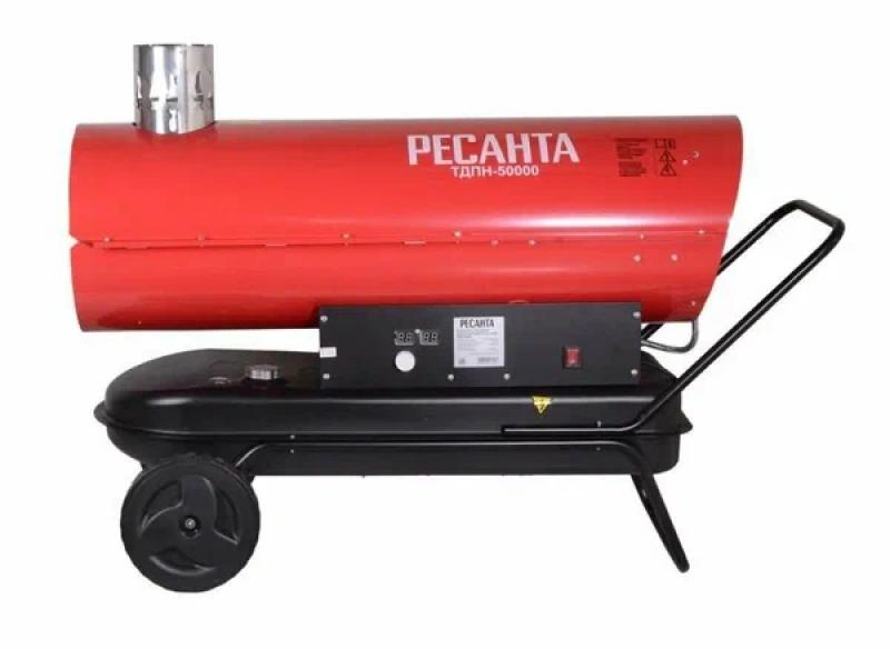 Тепловая пушка РЕСАНТА ТДПН-50000 — дизельная модель с непрямым нагревом, оснащённая пьезоподжигом, термостатом, системой контроля пламени и защитой от перегрева. Обеспечивает тепловую мощность 50 кВт при производительности 2000 м³/ч и расходе топлива 3,96 кг/ч. Работает от дизельного топлива, объём бака — 68 л, время непрерывной работы — до 15 часов. Корпус металлический, цилиндрической формы, красного цвета, снабжён колёсами и ручкой для перемещения, а также индикацией уровня топлива. Питание от сети 220 В. Размеры: 110.7х76.5х49.6 см. Вес: 57.8 кг.