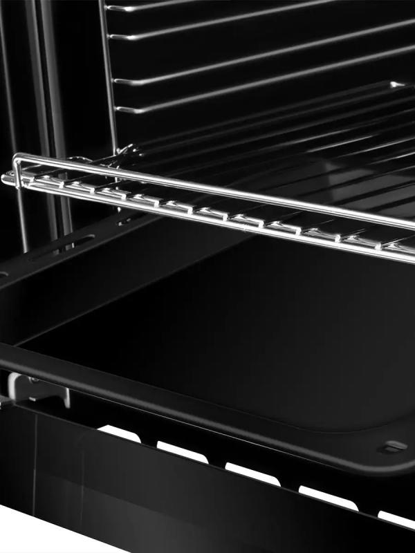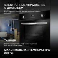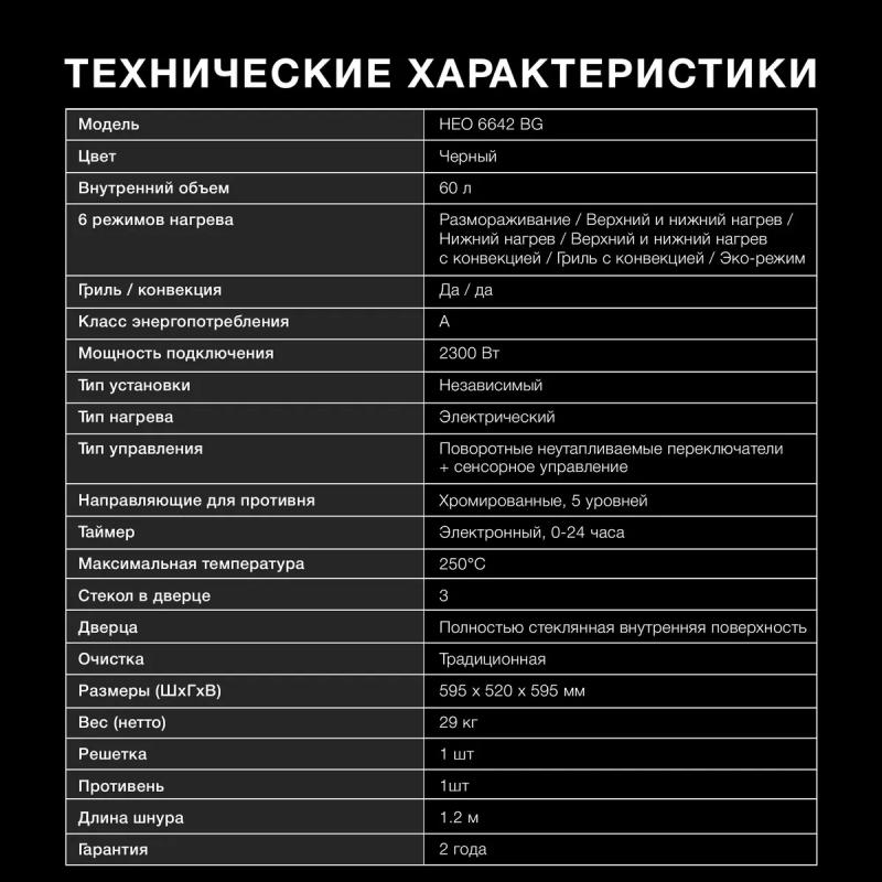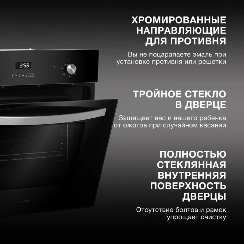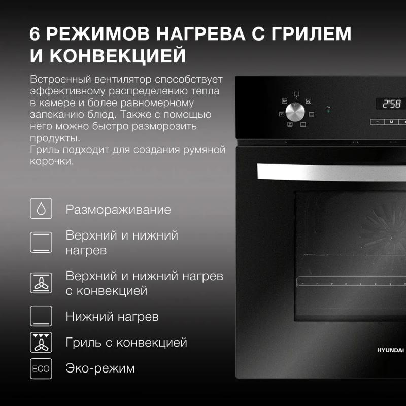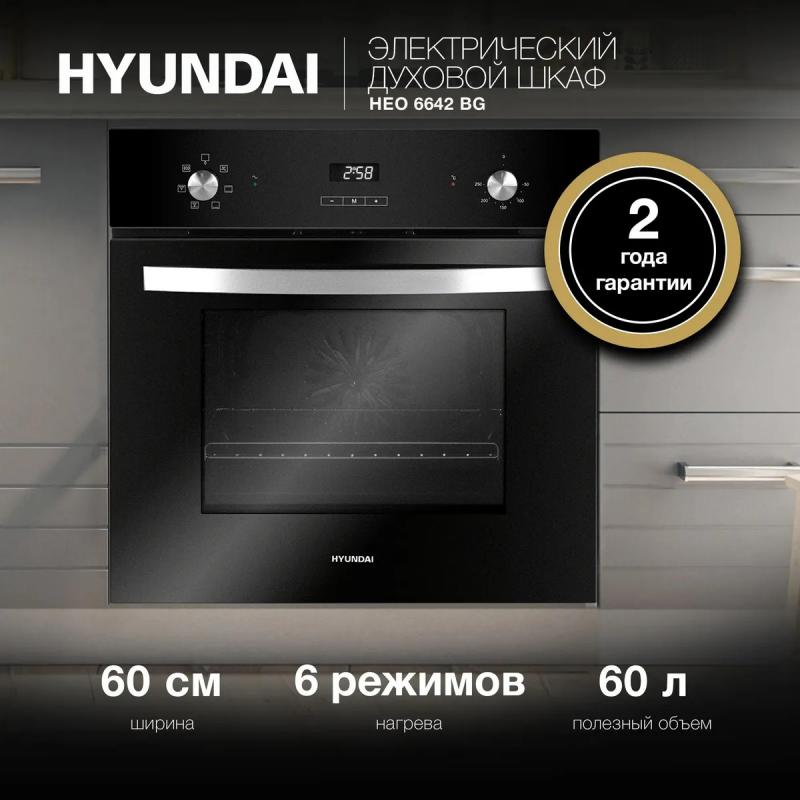 Духовой шкаф HYUNDAI HEO 6642 BG электрический, с сенсорным и поворотным управлением. Мощность подключения составляет 2300 Вт, максимальная температура нагрева достигает 250 °С. Внутреннее покрытие выполнено из эмали Easyclean, оснащен электрическим грилем и функциями отсрочки старта, таймера и часов. Имеется электронный таймер, 6 программ работы, подсветка с одной галогенной лампой мощностью 25 Вт. Дверца открывается вниз, содержит три стекла, присутствует дисплей и вентилятор охлаждения. Цвет черный с серебристым. Класс энергоэффективности A. Размеры составляют 59.5x52x59.5 см, вес 29.5 кг.
