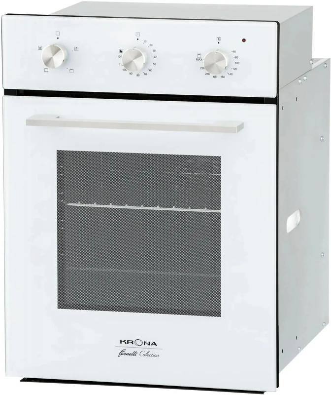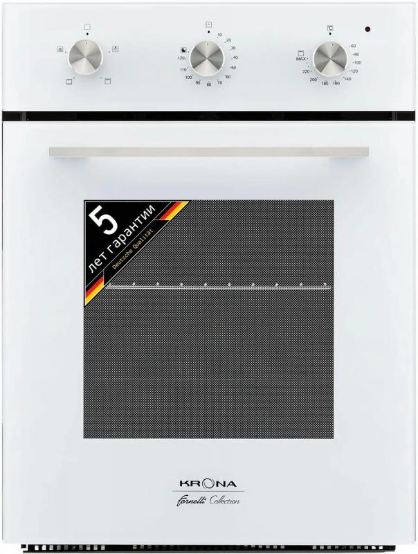 Духовой шкаф электрический KRONA Breve 45. Тип управления поворотный. Мощность подключения составляет 2656 Вт с максимальной температурой нагрева 260 °С. Имеется электрический гриль мощностью 2000 Вт. Предусмотрены режимы конвекции и гриля. Оснащен таймером электромеханического типа. Включает 4 программы работы. Дверца открывается вниз с двойным стеклом. Подсветка выполнена лампой накаливания мощностью 25 Вт. Оборудован звуковой индикацией и вентилятором охлаждения. Класс энергоэффективности A. Цвет белый. Размеры 44.7х57х59.1 см. Вес 29 кг.