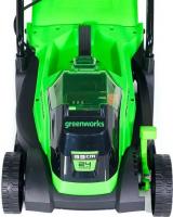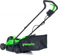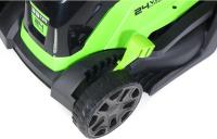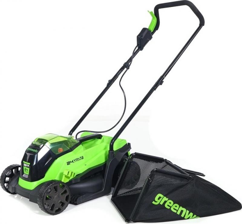Аккумуляторная газонокосилка Greenworks GD24LM33K2 с электрическим приводом. Несамоходная модель с шириной скашивания 33 см и регулировкой высоты в диапазоне 20-70 мм (5 уровней). Рекомендуемая площадь скашивания 600 м². Тканевый травосборник объемом 30 л на жестком каркасе. Четырехколесная конструкция, складная ручка. Функция мульчирования. Габариты 41.5х65.5х38 см. Вес: 9.5 кг.