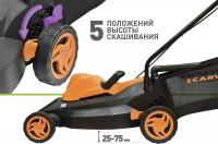 Газонокосилка CARVER LME-1840 с электрическим двигателем мощностью 1800 Вт (2.44 л.с.). Несамоходная, роторный нож, ширина скашивания 40 см, высота регулируется на 5 уровнях (27-75 мм). Тканевый травосборник на жестком каркасе, объем 35 л. Возможен задний выброс травы. Четырехколесная конструкция, пластиковые колеса, складная ручка, есть ручки для транспортировки. Мульчирование и защита от перегрузки не предусмотрены. Питание от электросети. Габариты: 71х48х29 см. Вес: 12.8 кг.