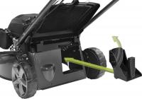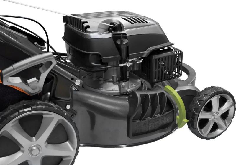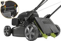 Газонокосилка CARVER LMG-2651DMS с бензиновым 4-тактным двигателем мощностью 2600 Вт (3.5 л.с.), объемом 139 см³. Самоходная, 1 скоростной режим. Роторный нож, ширина скашивания 50.8 см, высота регулируется на 6 уровнях (25-75 мм). Тканевый травосборник на жестком каркасе, объем 65 л. Возможен задний, боковой выброс и мульчирование. Четырехколесная конструкция, пластиковые колеса, складная ручка с регулировкой по высоте, есть ручки для транспортировки. Система самоочистки AutoWash, прочная стальная дека. Объем топливного бака 1 л. Габариты: 83х57х50 см. Вес: 37.3 кг.