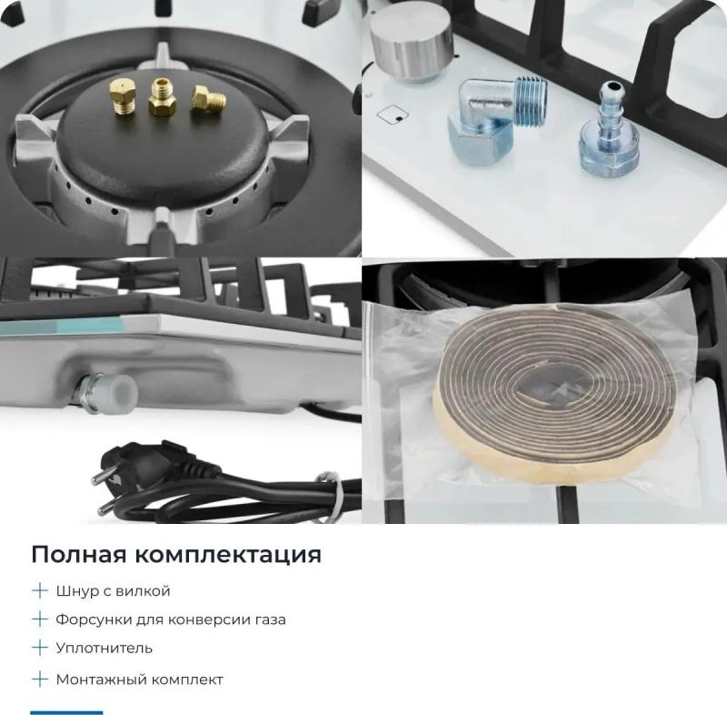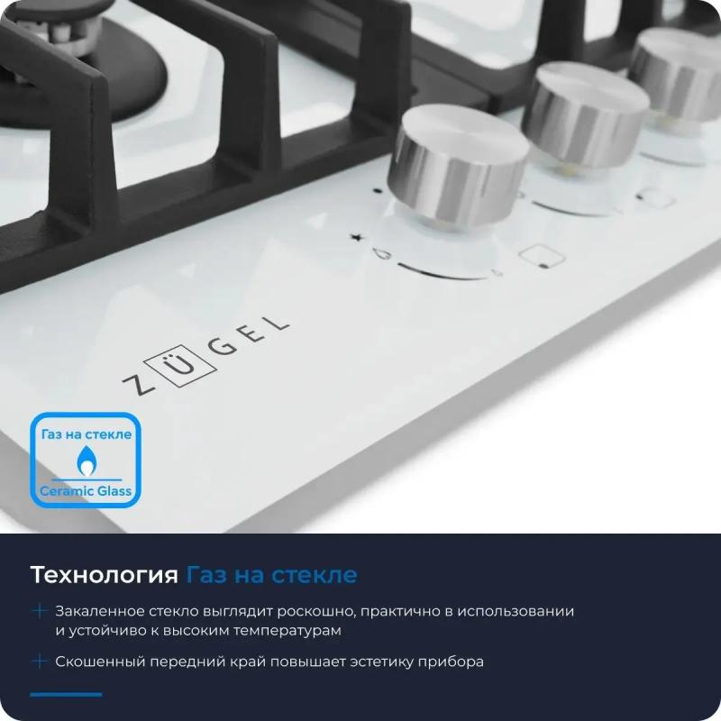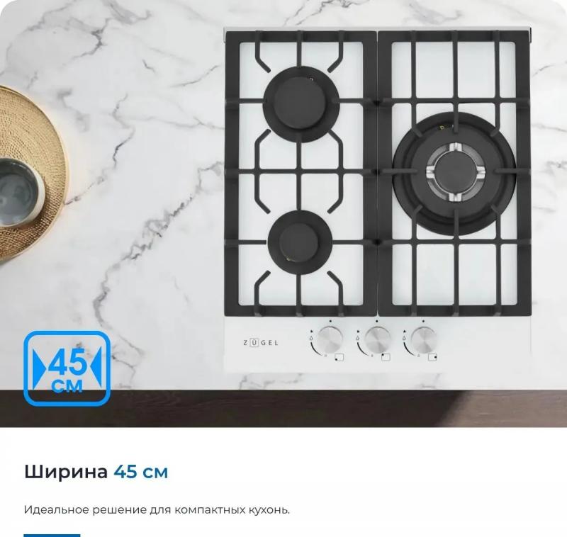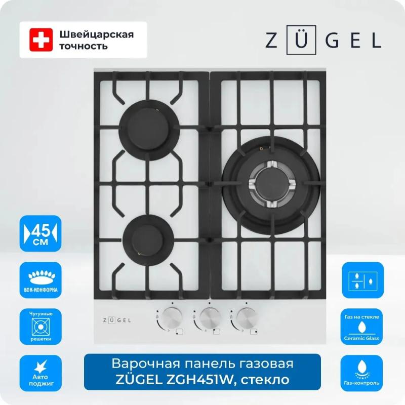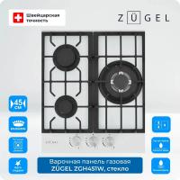 Газовая варочная поверхность ZUGEL ZGH451W с независимой установкой и управлением механического типа. Модель оснащена тремя конфорками, включая конфорку ВОК мощностью 3.4 кВт. Поверхность изготовлена из нержавеющей стали, решетки — из чугуна. Имеется электроподжиг в ручке и система газ-контроля. Подключение к электросети осуществляется через кабель с вилкой. Цвет — белый. Габариты: 450x500x100 мм. Вес (нетто) — 8.5 кг. Гарантия — 24 месяца.