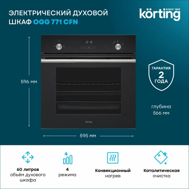 Газовый духовой шкаф KORTING OGG 771 CFN оснащен поворотными и сенсорными переключателями. Класс энергоэффективности A. Объем 60 литров. Максимальная температура нагрева 250 °C. Имеет конвекцию и газовый гриль. Включает электроподжиг и систему газ-контроля. Дисплей и электронный таймер присутствуют. Предусмотрено 4 программы: газовый гриль, конвекционный нагрев, нижний нагрев и размораживание. Вентилятор охлаждения и однокаскадные телескопические направляющие в комплекте. Дверца открывается вниз. Тройное стекло дверцы. Подсветка на 25 Вт. Звуковая индикация и защитное отключение включены. Длина кабеля 1.35 м. Цвет черный. Габариты изделия 59.5 х 58.5 х 59.6 см. Размеры для встраивания 56 x 56.5 x 59 см.