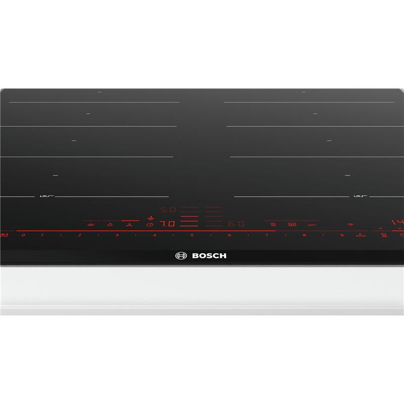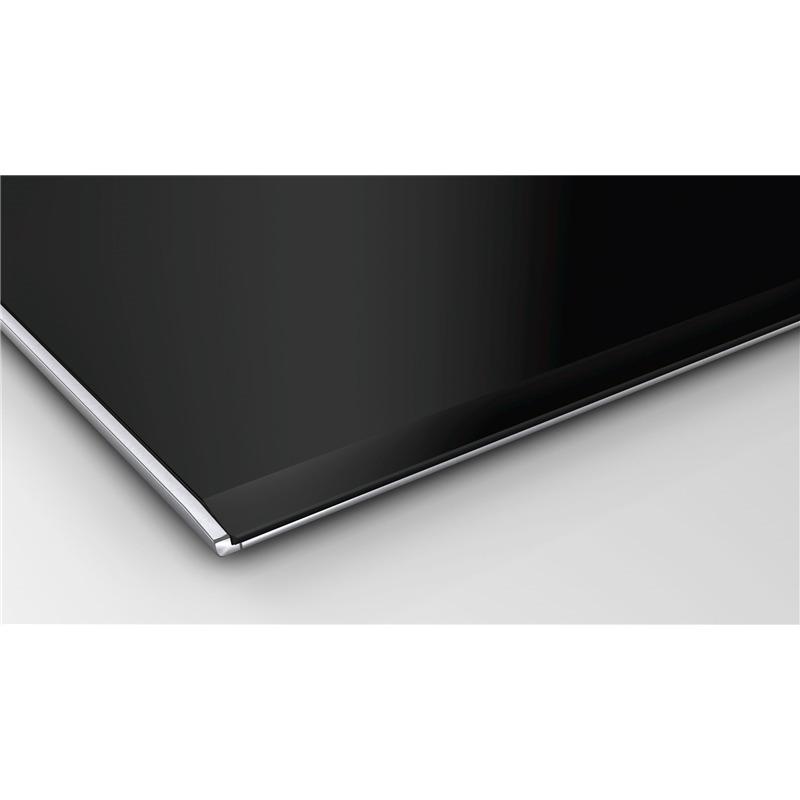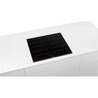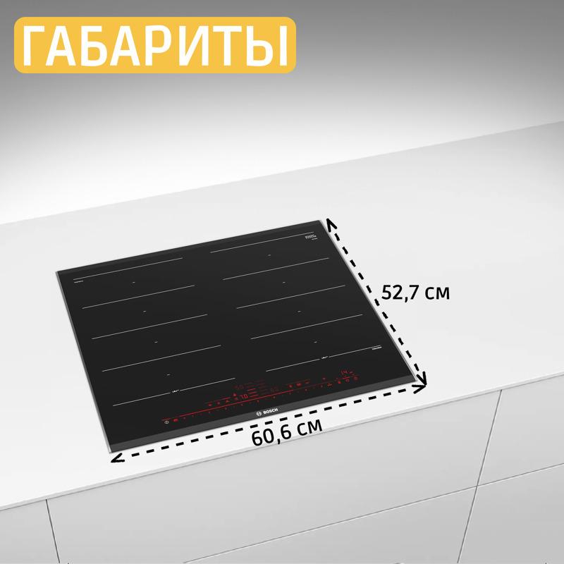 Варочная панель Bosch Serie 8 PXX675DV1E имеет четыре индукционные конфорки с функцией расширения зоны нагрева. Оснащена сенсорным управлением спереди и цифровым дисплеем. Обладает функциями автоматического выключения, защиты от детей, QuickStart и MoveMode. Есть режим быстрого нагрева и поддержания температуры. Предусмотрены таймер и различные индикации: остаточного тепла, выбранной мощности, включения и отсутствия посуды. Мощность конфорок составляет 3.7 кВт для ближней и дальней, 2.2 кВт для остальных. Панель потребляет 7400 Вт, оснащена сетевым кабелем длиной 1.1 м без вилки. Корпус выполнен из стеклокерамики с металлическими профилями по бокам. Габариты 592х522 мм, размер ниши для установки 560х490 мм, вес 14 кг.
