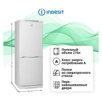 Холодильник INDESIT ES 16 A с нижним расположением морозильной камеры имеет механическое управление и относится к климатическому классу N. Общий объем составляет 299 литров, из которых 193 литра приходится на холодильную камеру и 85 литров на морозильную. Холодильное отделение содержит три закаленных стеклянных полки и два ящика, система размораживания ручная. Морозильная камера оснащена одной полкой и двумя ящиками, мощность замораживания достигает 2 кг/сутки. При отключении электропитания сохраняет температуру до 15 часов. Двери металлические с тремя полками, предусмотрена индикация открытой двери. В качестве хладагента используется R600a, установлен один стандартный компрессор. Класс энергопотребления A, годовое потребление электроэнергии 445 кВт*ч. Уровень шума не превышает 39 дБ. Направление открывания двери вправо, возможна переустановка. Габариты 60х167х61.5 см, вес 60.5 кг.