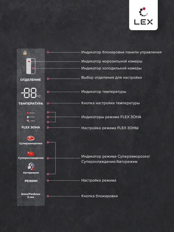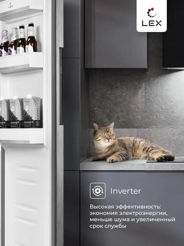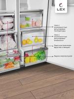Холодильник LEX LSB458StGIDBI имеет трехкамерную конструкцию с четырьмя дверями и общий объем 436 литров. В холодильной камере объемом 234 литра поддерживается температура от 2 до 8 градусов, реализована система No Frost, установлено три полки из пластика и три ящика. Морозильная камера расположена сбоку, ее объем составляет 202 литра, температурный диапазон от -15 до -23 градусов, также с системой No Frost. Устройство оснащено инверторным компрессором с хладагентом R600a, класс энергопотребления A++, годовое потребление электроэнергии 306 кВт*ч. Есть функции суперзаморозки и суперохлаждения, зона свежести с регулировкой температуры и влажности. Предусмотрены различные индикации, включая визуальную и звуковую сигнализацию. Управление электронное, дисплей внешний, уровень шума 37 дБ. Габариты 84.4 х 184.8 х 59.8 см, вес 101 кг.