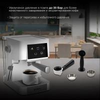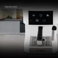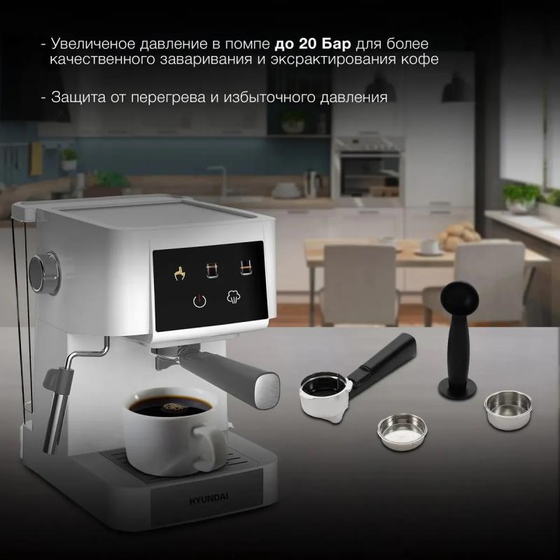 Кофеварка HYUNDAI HEM-3203 представляет собой рожковую модель с бойлерным типом нагревателя и мощностью 1000 Вт. Оборудована помпой на 20 бар и резервуаром для воды объемом 1.5 литра. Поддерживает приготовление эспрессо и капучино благодаря наличию функции подачи пара и горячей воды. Имеет механическое и электронное управление с подсветкой кнопок и сенсорным дисплеем. Комплектуется ручным капучинатором, прессом для кофе, фильтром-сито на одну и две порции, темпером с мерной ложкой. Оснащена панелью для подогрева чашек, индикаторами нагрева и уровня воды, съемным поддоном для капель. Предусмотрено предварительное заваривание и регулировка размера порций. Корпус изготовлен из пластика белого и серебристого цвета. Габариты устройства составляют 21.4 х 29.3 х 28.6 см, вес 2.92 кг.