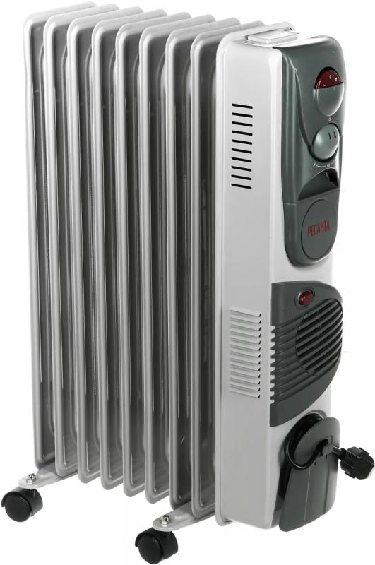 Масляный обогреватель РЕСАНТА ОМ-9АВ с мощностью 2400 Вт. Четыре режима работы: 800 Вт, 1200 Вт, 2000 Вт, 2400 Вт. Механическое управление. Термостат. Встроенный тепловентилятор. Защита от перегрева. Корпус из 9 секций радиатора белого цвета. Ролики для перемещения. Отсек для сетевого шнура. Размеры: 43х13х63 см. Вес: 8.63 кг.