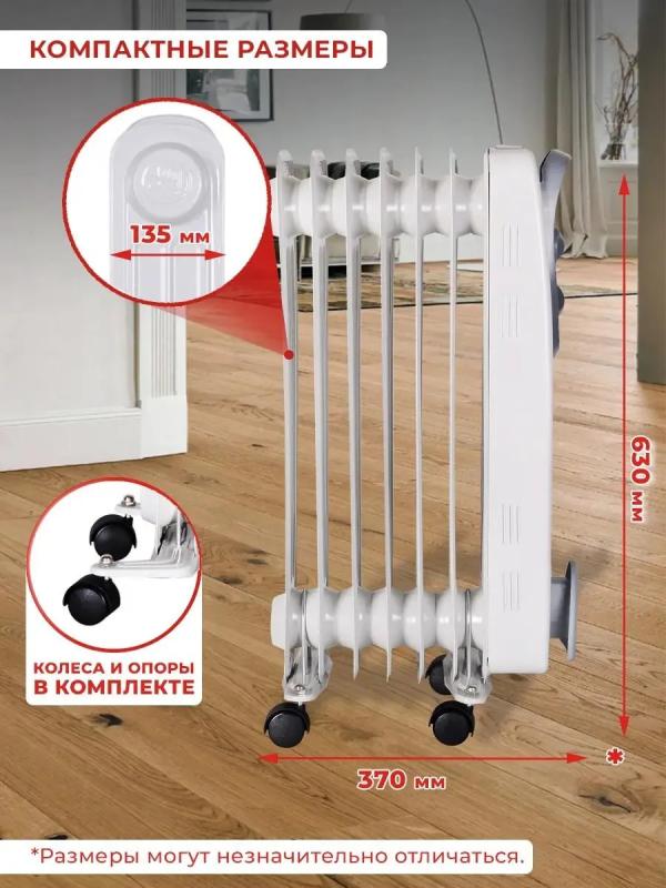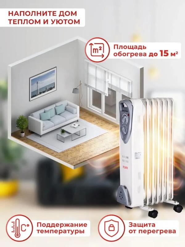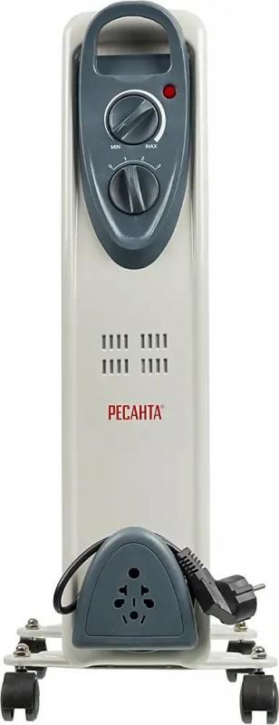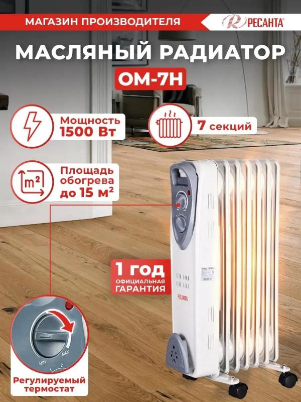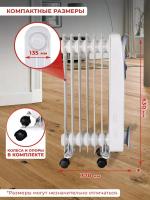 Масляный обогреватель РЕСАНТА ОМ-7Н с мощностью 1500 Вт. Три режима работы. Механическое управление. Термостат. Защита от перегрева. Корпус из семи стальных секций белого цвета. Ручка и ролики для перемещения. Отсек для сетевого шнура. Подходит для площади до 15 м². Размеры: 16х37х65 см. Вес: 7.4 кг.