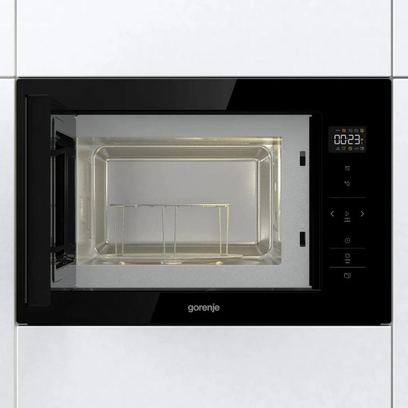 Микроволновая печь GORENJE BM251SG2BG имеет объем 25 литров и мощность микроволн 900 Вт. Управление электронное с английским языком панели, включает 5 ступеней регулировки мощности, звуковой сигнал окончания приготовления и возможность его отключения. Дверца открывается нажатием справа налево. Внутренняя камера из нержавеющей стали оснащена поворотным столом диаметром 315 мм. Модель предлагает 15 программ, включая автоматическую разморозку, автоматическое приготовление и режим гриля с мощностью 1000 Вт. Имеется кварцевый гриль, функция размораживания по весу и комбинированный режим микроволны с грилем. Корпус содержит дисплей и часы, есть внутреннее освещение и блокировка от детей. Комплектуется решеткой для гриля. Реализована система очистки AquaClean. Размеры (ШхВхГ) составляют 59.5 х 38.8 х 40.1 см, размеры ниши (ШхВхГ) - 56 х 38 х 50 см. Вес устройства 19.5 кг.