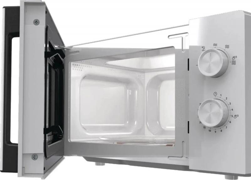 Микроволновая печь GORENJE MO20E1WH имеет объем 20 литров и мощность 800 Вт. Управление механическое, дверца открывается справа налево с помощью ручки. Оснащена звуковым сигналом окончания приготовления и системой регулировки мощности на пять ступеней. Диаметр поворотного стола составляет 255 мм. Предусмотрены режимы автоматической разморозки и соло. Модель оборудована системой очистки AquaClean. Цвет белый. Размеры внешние составляют 45.5 х 26.1 х 35.3 см, внутренние размеры камеры 30.2 х 21.5 х 35.3 см. Вес устройства 10.3 кг.