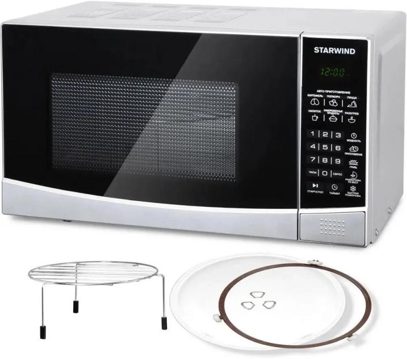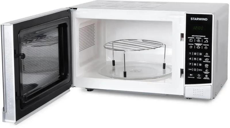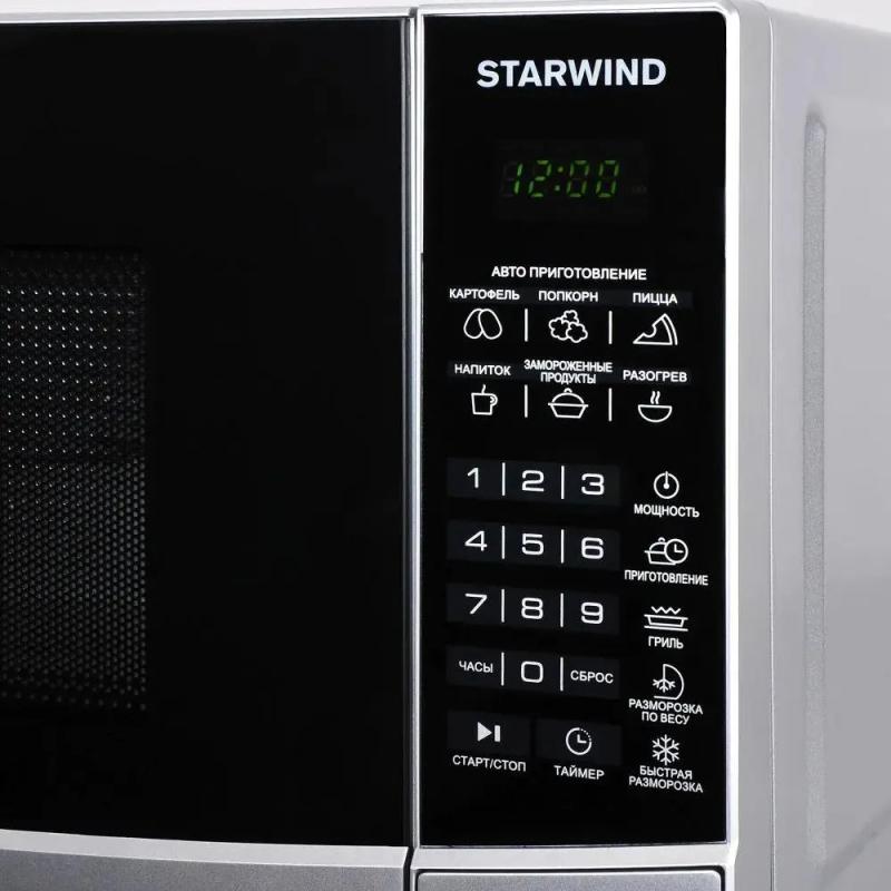 Микроволновая печь STARWIND SMW2820 с объемом 20 л и мощностью микроволн 700 Вт оснащена электронным управлением, системой открывания дверцы кнопкой справа-налево, дисплеем, часами и регулировкой мощности, имеет внутреннее покрытие камеры из эмали легкой очистки, диаметр поворотного стола 245 мм, режимы автоматической разморозки, автоматического разогрева, автоматического приготовления, гриль, дополнительные функции размораживания по весу, комбинированного режима микроволны+гриль и ускоренной разморозки, комплектуется решеткой для гриля, цвет серебристый/черный, размеры (ШхВхГ) 45.2 х 26.2 х 32.7 см, вес 11.3 кг.