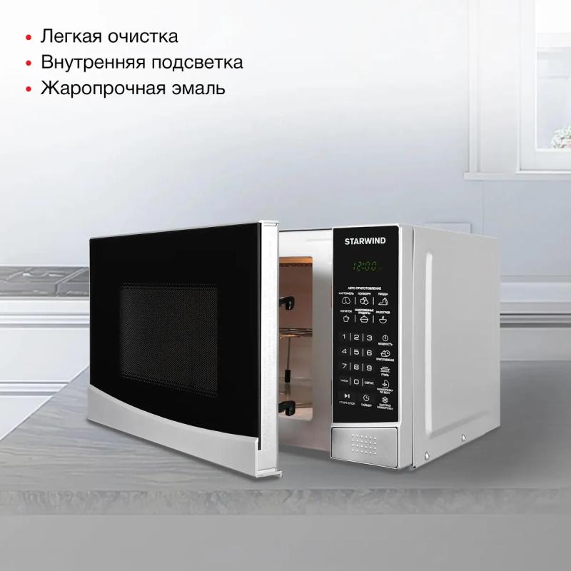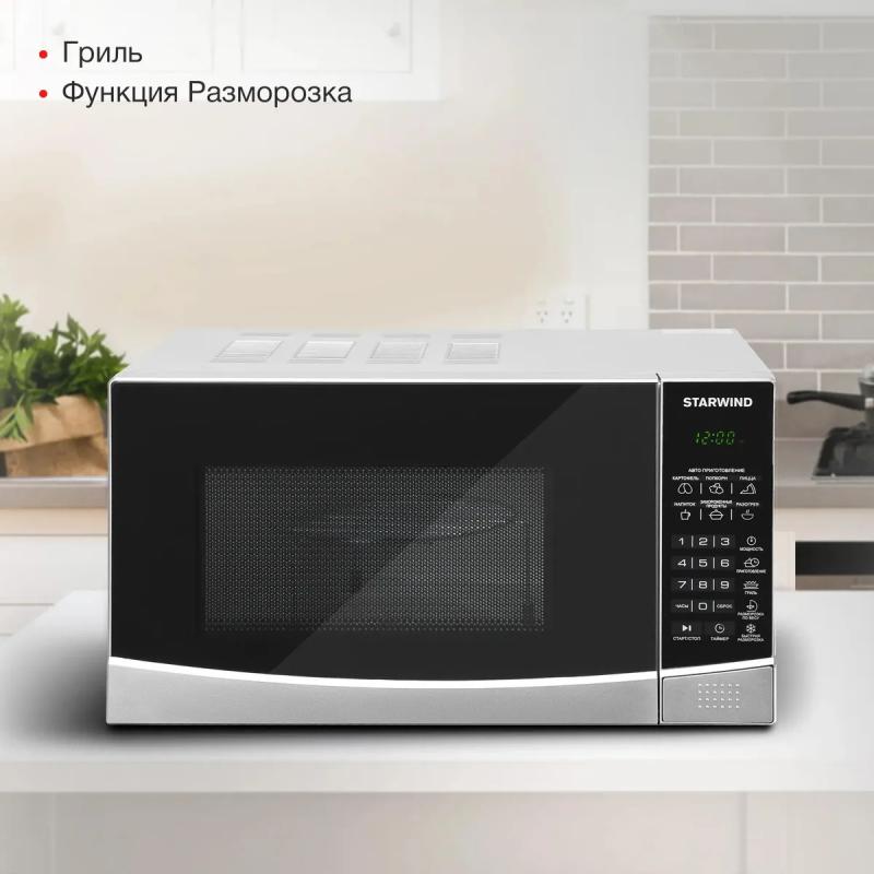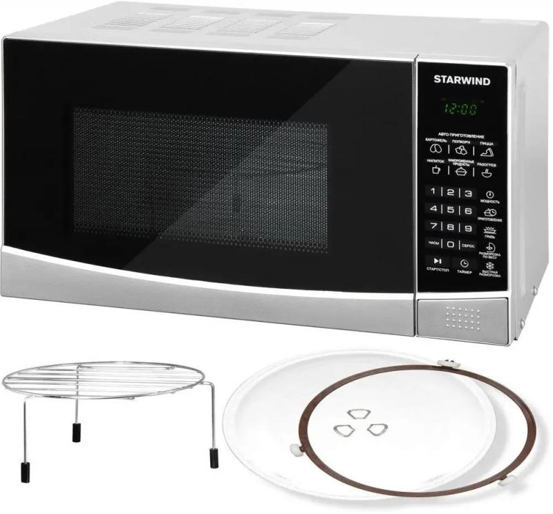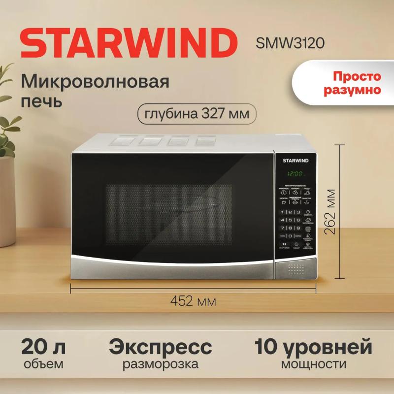 Микроволновая печь STARWIND SMW3120 с объемом 20 л и мощностью микроволн 700 Вт оснащена электронным управлением, кнопкой открывания дверцы справа-налево, дисплеем, часами и системой регулировки мощности. Внутреннее покрытие камеры выполнено из эмали легкой очистки, диаметр поворотного стола составляет 245 мм. Мощность тэнового гриля равна 850 Вт, доступны режимы автоматической разморозки, разогрева, приготовления, микроволны+гриль, экспресс-режимы и функции блокировки от детей, памяти рецептов, программирования процесса приготовления. Комплект включает решетку для гриля. Размеры (ШхВхГ): 45.2 х 26.2 х 32.7 см, вес: 11.3 кг.