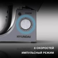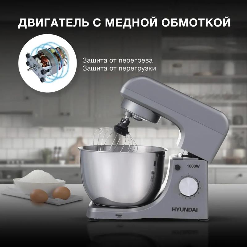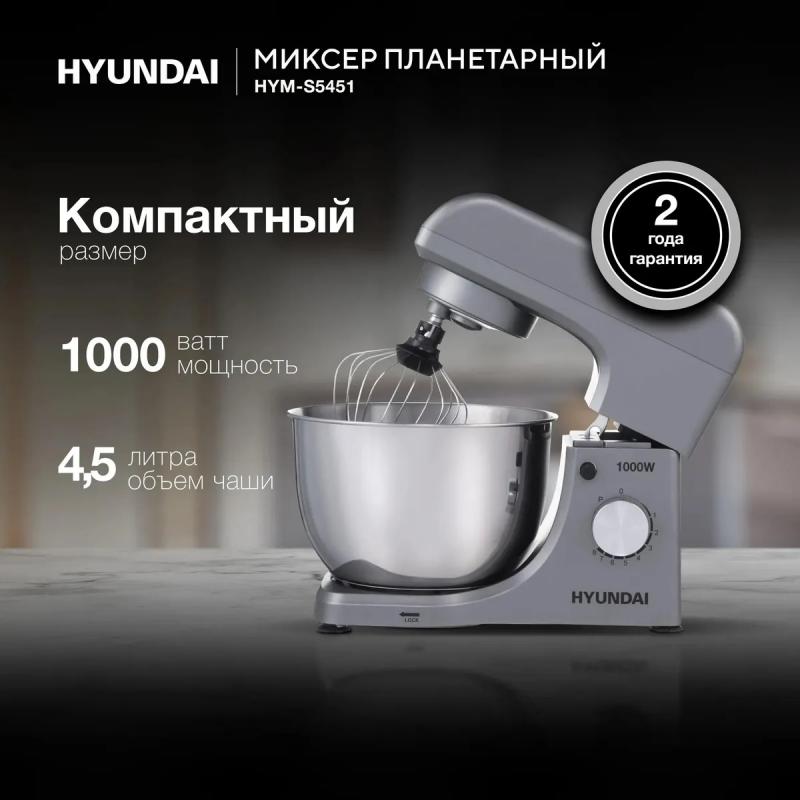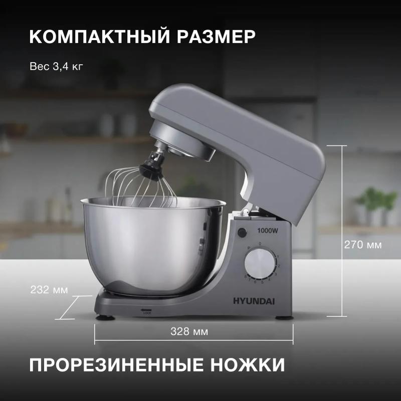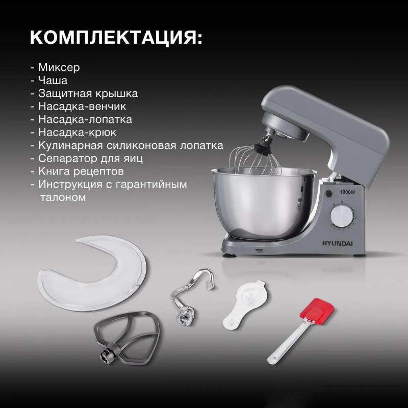 Планетарный миксер HYUNDAI HYM-S5451 оснащен мотором мощностью 1000 Вт и обеспечивает работу на 8 скоростных режимах с возможностью импульсного включения. Модель имеет металлическую чашу объемом 4.5 литра с максимальной загрузкой 1.5 кг. Скорость вращения насадок составляет 140 оборотов в минуту. Корпус выполнен из пластика с прорезиненными ножками для устойчивости. Безопасность использования соответствует классу защиты II. В комплект входят три насадки: венчик для взбивания, крюки для теста и лопатка для перемешивания. Дополнительно поставляются защитный обод и книга рецептов. Длина электрического кабеля составляет 1.3 метра. Цвет миксера серый с черным. Размеры прибора 328 х 232 х 270 мм, вес 3.4 кг.