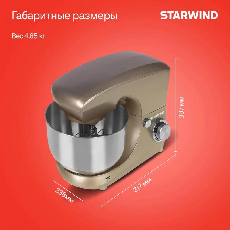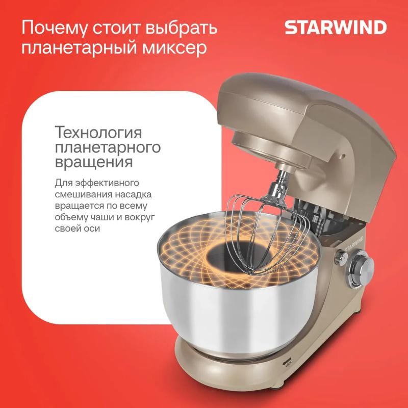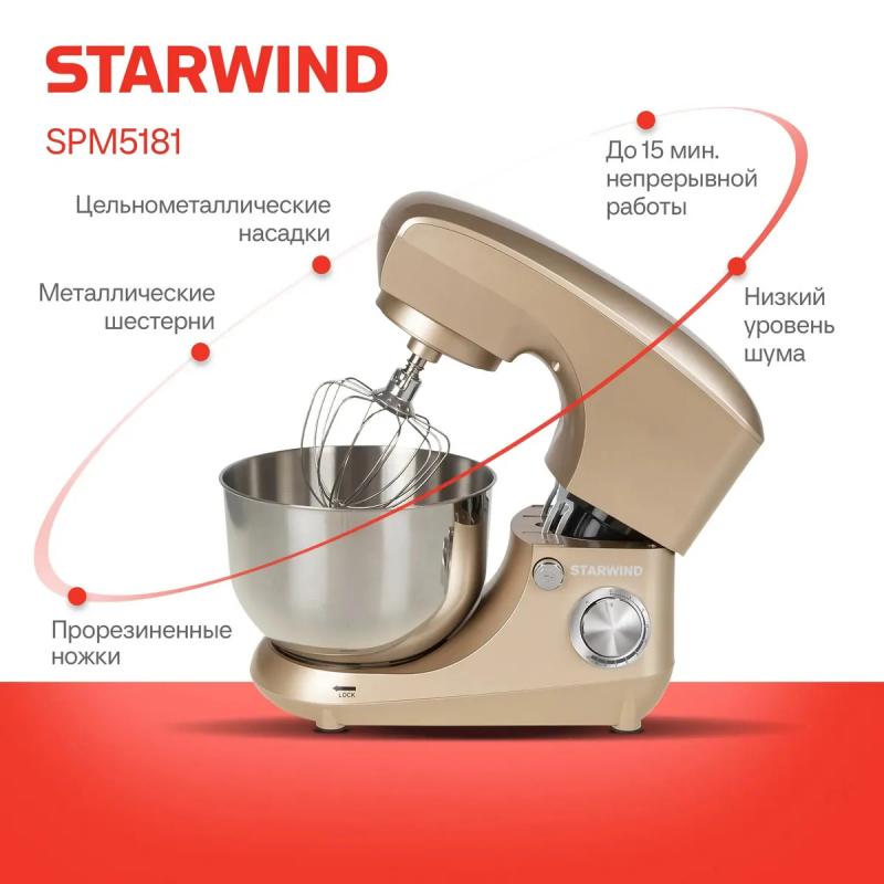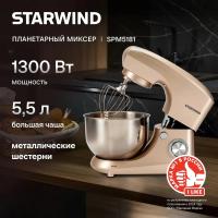 Планетарный миксер STARWIND SPM5181 имеет мощность 1300 Вт и обеспечивает 10 скоростных режимов работы. Модель оснащена импульсным режимом и обеспечивает скорость вращения 200 об/мин. Объем чаши из нержавеющей стали составляет 5.5 л, максимальная загрузка продуктов - 1.5 кг. Корпус изготовлен из пластика, имеются прорезиненные ножки для устойчивости. Безопасность использования подтверждена классом защиты II. В комплект входят три насадки: венчик для взбивания, крюки для теста и лопатка для перемешивания. Также поставляется защитный обод и книга рецептов. Длина электрического кабеля составляет 1.3 м. Цвет модели золотистый. Габариты устройства 238 х 317 х 387 мм, вес 4.85 кг.