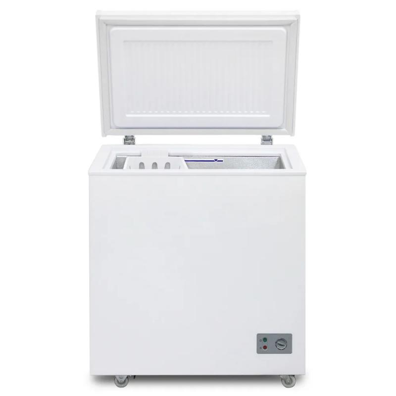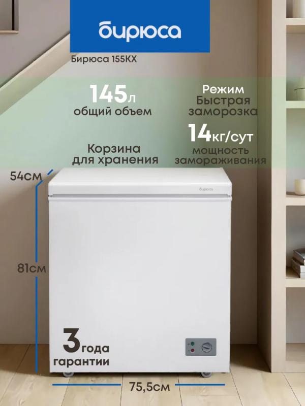 Морозильная камера БИРЮСА Б-155KX с механическим типом управления и одним компрессором имеет полезный объем 145 литров. Оборудована системой ручного размораживания и функцией суперзаморозки. Мощность замораживания достигает 14 кг/сутки. При отключении электропитания сохраняет низкую температуру до 38 часов. Оснащена одной дверью с верхним открыванием и одной корзиной для хранения продуктов. Годовое потребление электроэнергии составляет 365 кВт*ч при мощности 90 Вт. Имеет звуковую индикацию незакрытой двери и работы. Модель установлена на колеса для удобства перемещения. Размеры устройства 75.5 х 81 х 54 см, вес 27 кг.