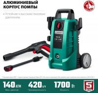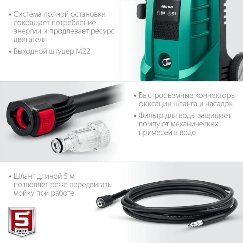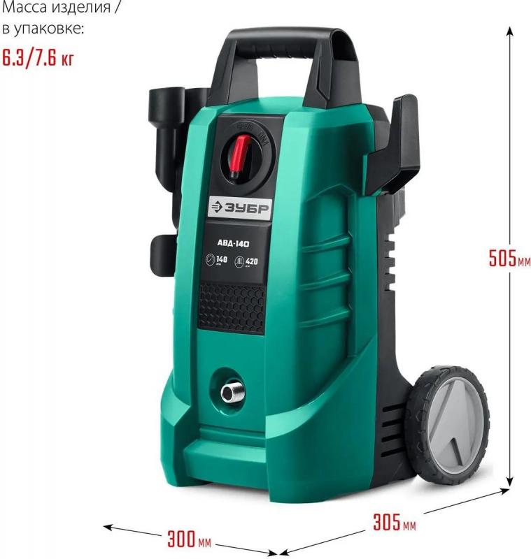 Мойка высокого давления ЗУБР АВД-140 с электрическим щеточным двигателем мощностью 1700 Вт обеспечивает давление от 90 до 140 бар. Устройство оснащено внешним баком для чистящего средства объемом 0.7 л, струйной трубкой Vario-Power и турбонасадкой. В комплекте: пистолет, пеногенератор, шланг высокого давления длиной 5 м, сетевой кабель 5 м с автоматической намоткой, фильтр и другие аксессуары. Входной шланг с резьбой 3/4". Вес устройства без принадлежностей: 6.3 кг.