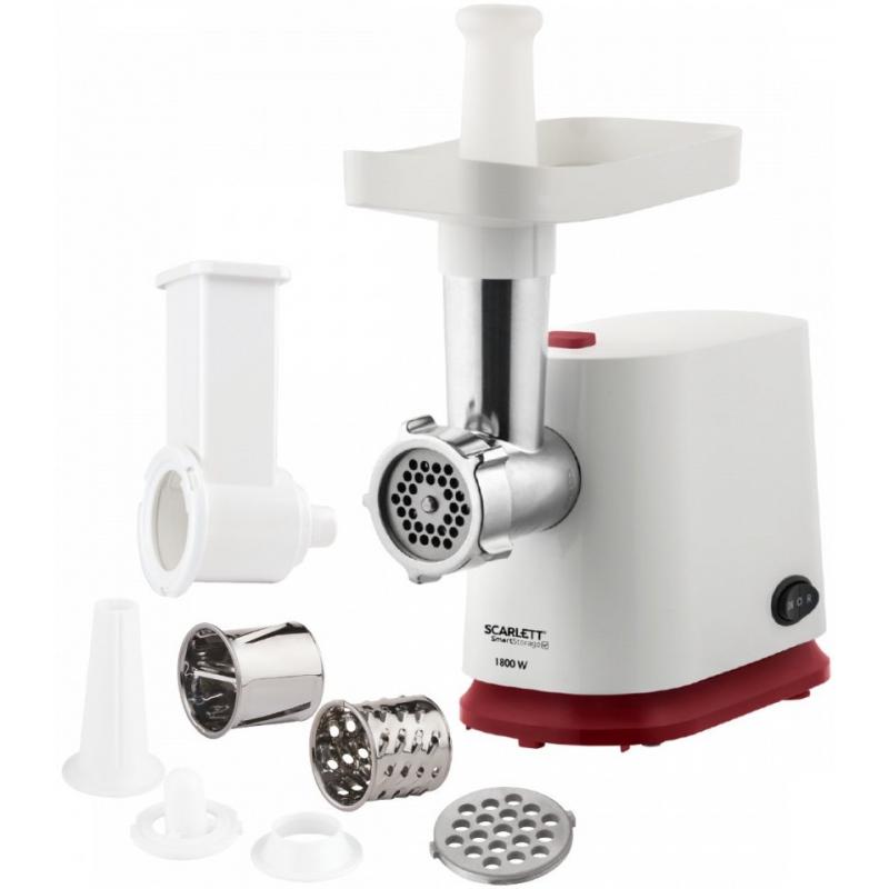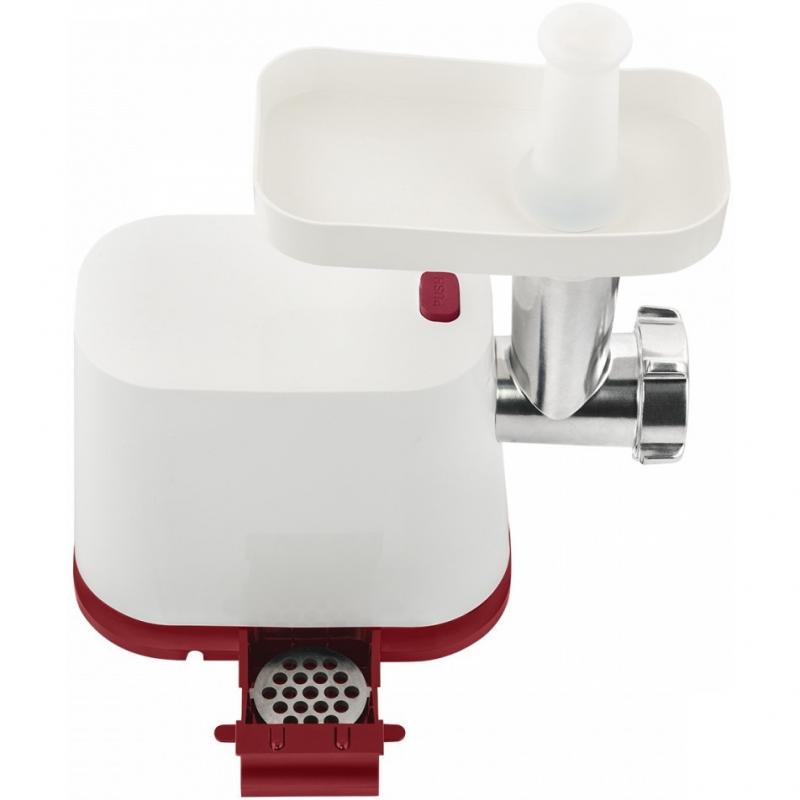 300 Вт номинальная, 1800 Вт максимальная, производительность 2 кг/мин, система реверса, защита двигателя от перегрузки, отсек для хранения насадок, отсек для хранения шнура, лоток - пластик, корпус - пластик, 2 диска для фарша ; 2 насадки для нарезки/шинковки; для кеббе; для домашних колбас, 5 и 7 мм.