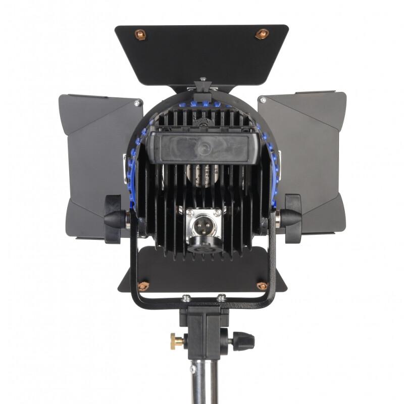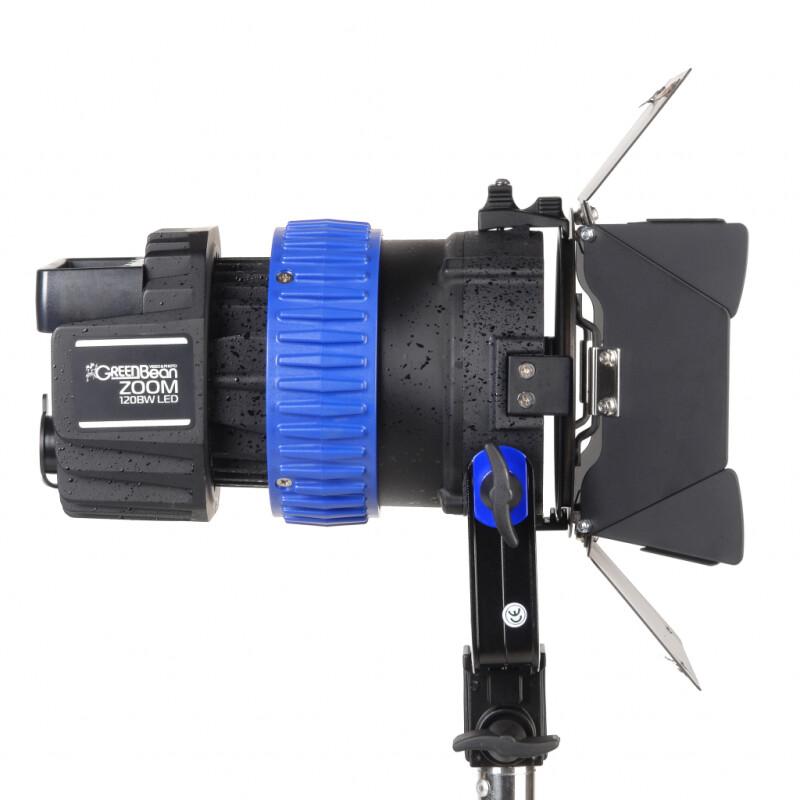 GreenBean ZOOM 120BW LED представляет собой студийный светодиодный осветитель с асферической линзой и линзой Френеля, мощностью 120 Вт и цветовой температурой 5600 К (±150 К). Индекс цветопередачи CRI >95. Яркость регулируется плавно от 5% до 100% без мерцания (технология Flicker Free). При использовании комплектного конверсионного фильтра цветовая температура снижается до 3500 К. Питание — от сети (120–240 В) или от внешних аккумуляторов (12–24 В через 2-pin разъём или V-mount). Охлаждение — активное, с вентилятором. Совместим с аксессуарами через байонет Bowens. В комплекте — восьмилепестковые шторки с возможностью крепления гелевых фильтров и дополнительные лепестки для точечного контроля засветки. Корпус выполнен из алюминиевого сплава. Вес: 2.7 кг.