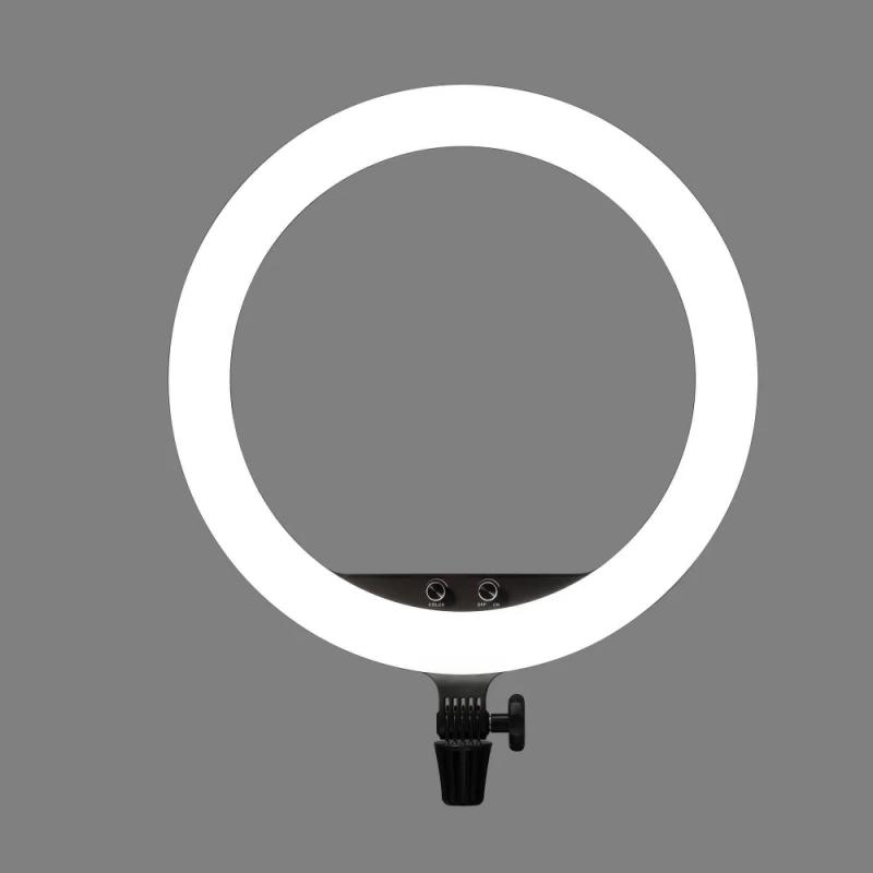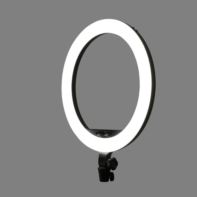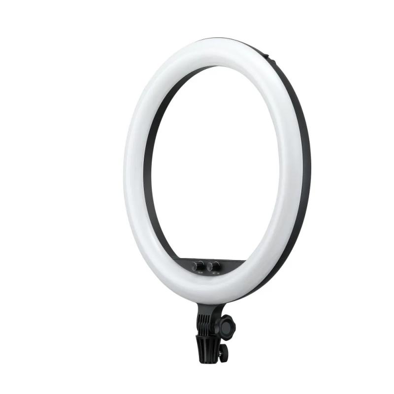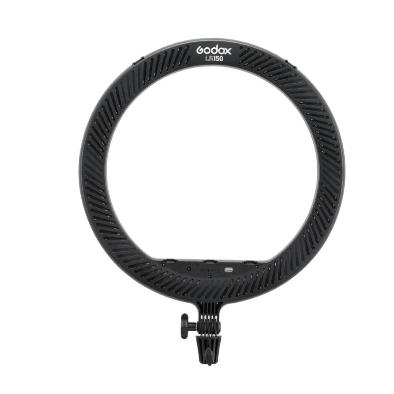 Godox LR150 LED Black представляет собой кольцевой светодиодный осветитель мощностью 38 Вт с 336 светодиодами. Цветовая температура регулируется бесступенчато от 3000 К до 6000 К, яркость — от 1% до 100%. Индекс цветопередачи CRI/TLCI >90. Освещенность на расстоянии 0.5 м при максимальной мощности — 1400 лк. Питание осуществляется от сети 100–240 В через комплектный сетевой адаптер (24 В, 2 А). На корпусе предусмотрен USB-порт (5 В, 2 А) для зарядки смартфона (кабель не входит). В комплект входит держатель для смартфона (ширина 57–90 мм) на гибкой штанге с шаровым шарниром. Осветитель оснащен пятью креплениями «башмак» (три внутри кольца, два снаружи) и устанавливается на шпигот 5/8". Корпус черного цвета. Вес: 880 г.
