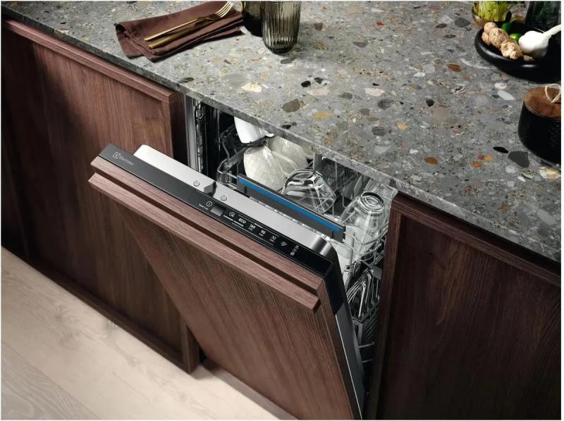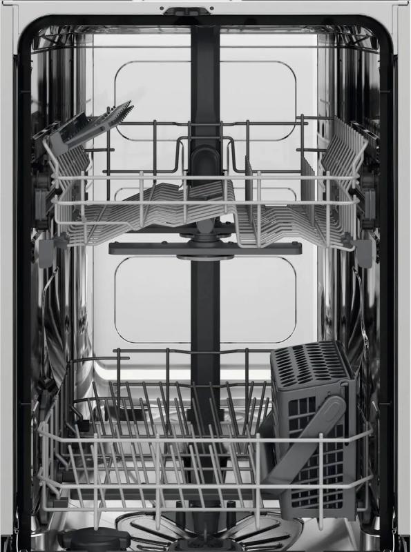 Представляем посудомоечную машину ELECTROLUX EEA22100L с узким типом корпуса и полной встраиваемостью. Модель рассчитана на загрузку 9 комплектов посуды и оснащена конденсационной системой сушки с технологией AirDry. Расход воды составляет 9.9 литров, уровень шума не превышает 47 дБ. Машина предлагает 6 программ мойки, включая стандартную, экономичную и экспресс-программу со временем работы 90 минут. Имеется электронное управление с таймером отсрочки запуска до 3 часов. Индикация включает оповещение о наличии ополаскивателя и соли. Поддерживается подключение к горячей воде и использование средств 3 в 1. Класс энергопотребления A+++, класс сушки A. Внутреннее пространство организовано с помощью полок для кружек и регулируемой по высоте корзины. Питание осуществляется от сети 220-240 В, длина сетевого кабеля 150 см. Габариты прибора: ширина 44.6 см, высота 81.8 см, глубина 55 см. Для встраивания требуется ниша размерами: ширина 45 см, высота от 82 до 90 см, глубина 55 см. Корпус выполнен из металла с черной панелью управления.
