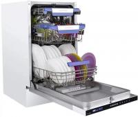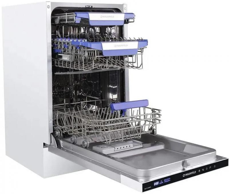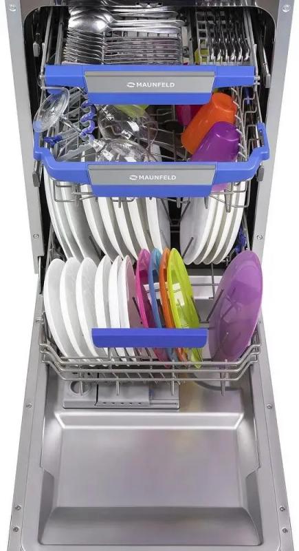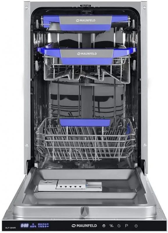 Посудомоечная машина MAUNFELD MLP-08IMR с узким типом корпуса и полной встраиваемостью имеет загрузку до 10 комплектов посуды. Оборудована дисплеем и конденсационной системой сушки. Расход воды достигает 9 литров, уровень шума составляет 47 дБ. Предусмотрено 7 температурных режимов и 9 программ мойки, включая автоматическую, интенсивную, стандартную, экономичную ECO, для стекла, экспресс-программу и режим половинной загрузки. Время мойки при обычной программе составляет 186 минут. Оснащена тремя корзинами, включая регулируемую по высоте и отсек для столовых приборов. Имеет электронное управление, защиту от протечек AquaStop, таймер отсрочки запуска до 24 часов и индикацию наличия соли, ополаскивателя. Поддерживает использование средств 3 в 1. Классы эффективности: мойка A, энергопотребление A++, сушка A. Мощность потребления 2100 Вт при напряжении 220-240 В. Габариты (ШхВхГ) составляют 44.5x81.5x55 см, вес 32.7 кг. Размеры ниши для встраивания: ширина 45 см, минимальная высота 82 см, глубина 58 см.