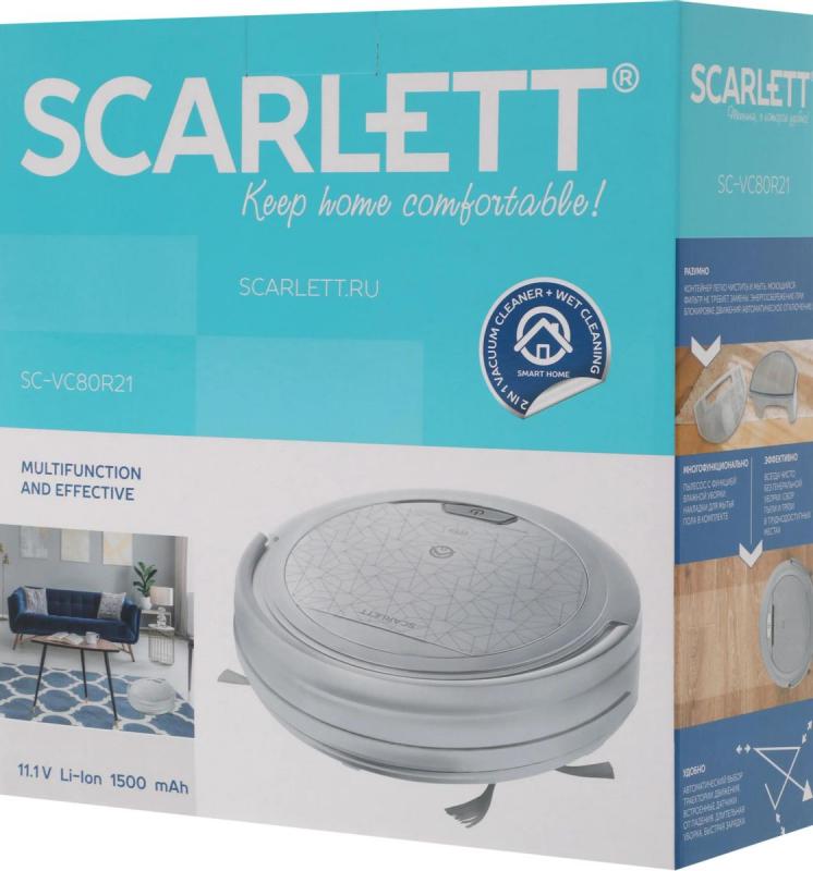 Робот-пылесос 2в1 SCARLETT SC-VC80R21 в стильном компактном дизайне - сочетание пылесоса и влажной уборки для вашего дома! Робот автоматически меняет траекторию движения каждые 5-7 минут для более эффективной уборки. Встроенные датчики от падения предотвращают падение прибора в случае ступенек или других перепадов высоты. Внутри робота находится надежный аккумулятор Li-Ion, благодаря которому время работы без подзарядки при сухой уборке до 95 минут! Звуковая и цветовая индикация низкого заряда аккумулятора упростит эксплуатацию. При блокировке движения, робот автоматически отключается (режим энергосбережения). Прибор заряжается 2,5 часа.