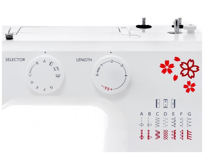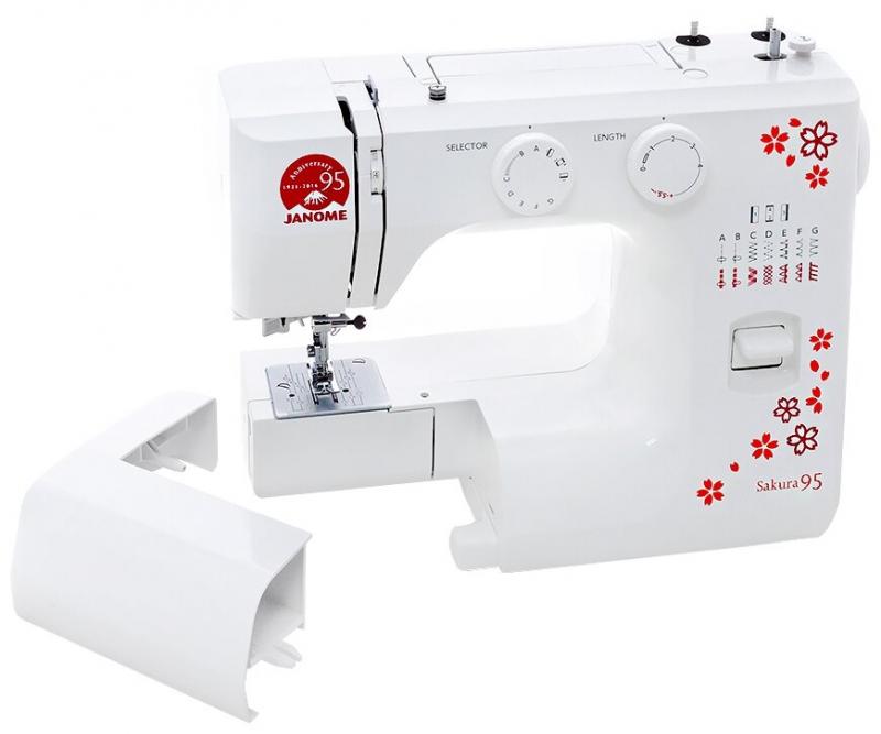 Швейная машина Janome Sakura 95 имеет белоснежный корпус с красными цветами. 15 функций, в том числе, выметывание бельевых петель в режиме полуавтомата, оверлочную, прямую, смещенную, потайную строчки и прочее. Скорость движения иглы не более 450 стежков в минуту. За продвижение ткани отвечает трехполосный нижний транспортер. Облегчает процесс обработки текстильных изделий нитевдеватель, нитеобрезыватель, встроенная подсветка в виде лампы накаливания. Вес: 5.7 кг.