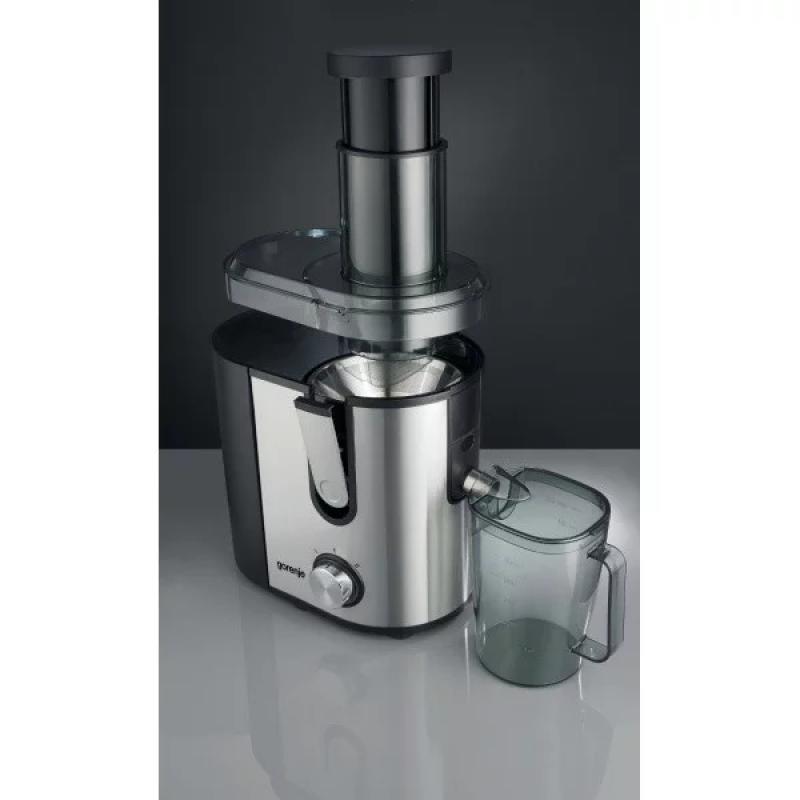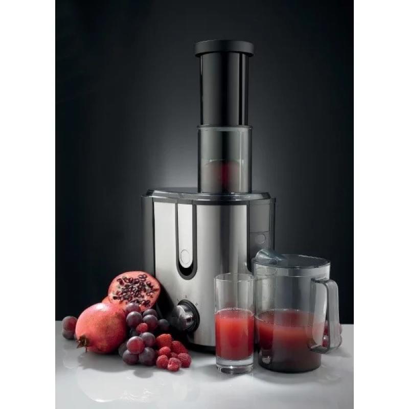 Центробежная, мощность 900 Вт, резервуар для сока - 1 л, отдельностоящая, сбор мякоти - 1.5 л, круглая горловина, автоматический выброс мякоти; система "капля-стоп"; защита от случайного включения, количество скоростей 2, материал корпуса сталь