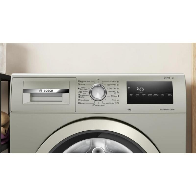 Стиральная машина BOSCH WAN2420XME с фронтальной загрузкой оснащена инверторным мотором и электронным управлением. Панель управления на английском языке имеет дисплей и сенсорное управление. Максимальная загрузка составляет 8 кг при скорости отжима до 1200 об/мин. Уровень шума не превышает 55 дБ при стирке и 73 дБ при отжиме. Машина расходует 45 литров воды за цикл, барабан выполнен из нержавеющей стали. Имеется частичная защита от протечек, блокировка от детей и случайного нажатия, таймер отсрочки до 24 часов. В наборе 15 программ включая быструю, гигиеническую, деликатную и специальные режимы для разных типов ткани. Классы эффективности: стирка A, отжим B, энергопотребление A+++. Габариты (ШхВхГ) составляют 59.8x84.8x63.5 см. Вес 68 кг.
