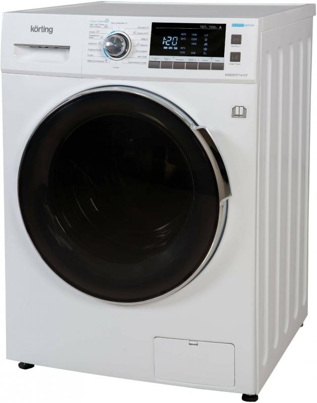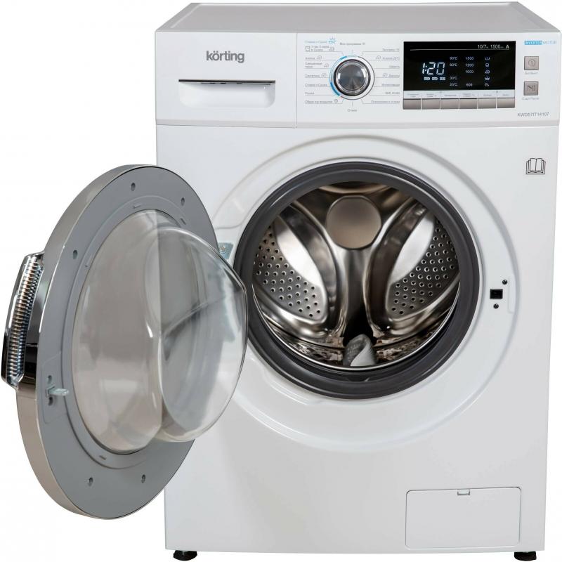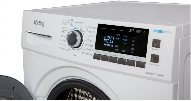 Стиральная машина KORTING KWD 57IT14107 с фронтальной загрузкой оснащена инверторным мотором и электронным управлением на русском языке. Максимальная загрузка для стирки составляет 10 кг, для сушки - 7 кг. Диаметр загрузочного люка 48 см, открывание влево под углом 165°. Скорость отжима регулируется от 0 до 1500 об/мин. Уровень шума при стирке 57 дБ, при отжиме 80 дБ. Расход воды за цикл 160 л. Барабан из нержавеющей стали, бак полимерный. Есть 16 программ, включая экспресс-стирку за 15 минут, режимы "Турбо" и "Моя программа". Предусмотрены защита от детей, контроль дисбаланса и пены, самодиагностика, таймер отсрочки до 24 часов. Температура стирки регулируется в диапазоне 20-90°C. Классы: стирки A, отжима B, энергопотребления A. Потребляемая мощность 1900 Вт, длина кабеля 1.5 м. Габариты (ШхВхГ) 59.5 х 85 х 56.5 см, вес 72 кг.