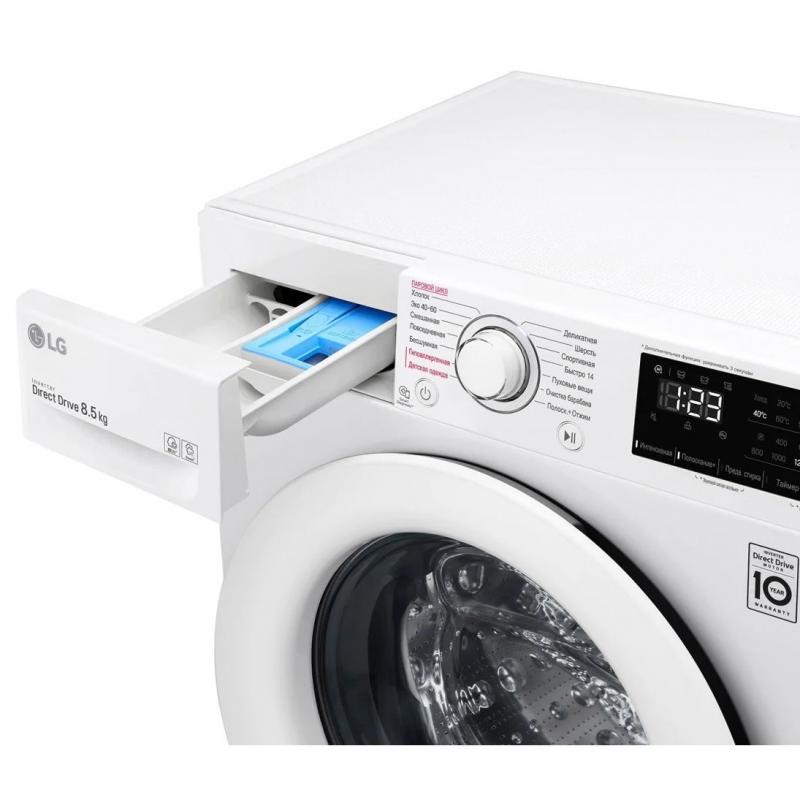 Стиральная машина LG F2V3GS3W с фронтальной загрузкой оснащена инверторным мотором с прямым приводом. Вместимость до 8.5 кг, скорость отжима до 1200 об/мин. Управление электронно-механическое, панель на русском языке. Диаметр люка 35 см, открывание вправо под углом 150°. Уровень шума при стирке 54 дБ, при отжиме 70 дБ. Расход воды 55 л. Предусмотрены защита от детей, контроль пены, самодиагностика, таймер отсрочки до 19 ч. 14 программ и 4 режима, включая паровую обработку. Температура стирки регулируется от 20 до 90°C. Классы: стирки A, отжима B, энергопотребления A. Габариты (ШхВхГ) 60х85х47.5 см, глубина с выступами 53.5 см, вес 56 кг.