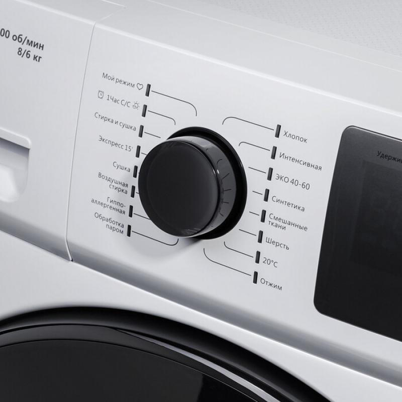 Стиральная машина с сушкой MAUNFELD MFWM1586WH оснащена инверторным двигателем и электронным управлением с русскоязычной панелью. Фронтальная загрузка позволяет стирать до 8 кг белья и сушить до 6 кг. Скорость отжима достигает 1500 об/мин. Уровень шума при стирке составляет 57 дБ, при отжиме - 79 дБ. Расход воды за цикл - 64 литра. Бак изготовлен из пластика. Модель включает 16 программ, в том числе паровую обработку и гипоаллергенную стирку. Есть дисплей, защита от детей и таймер отсрочки на 24 часа. Диапазон температур стирки - от 20°C до 90°C. Классы: стирки A, отжима B, энергопотребления A. Потребляемая мощность - 1900 Вт. Габариты (ШхВхГ): 59.5 х 85 х 47 см, вес 65 кг. Цвет корпуса белый, люк черный.
