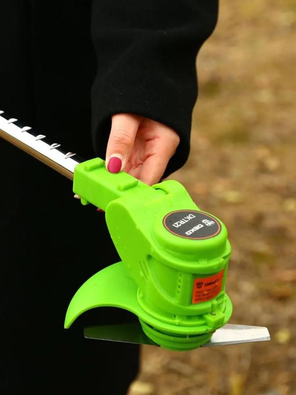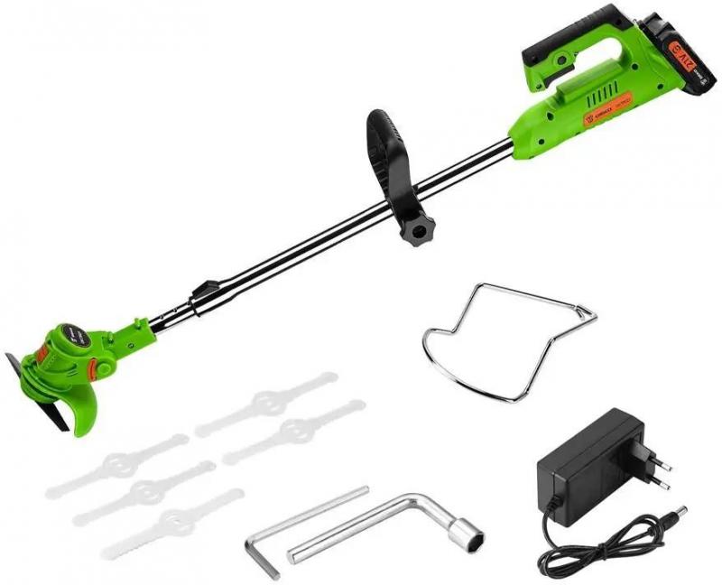 Аккумуляторный триммер DEKO DKTR21 с нижним расположением двигателя и неразборной штангой. Питание от Li-Ion аккумулятора 21 В, время зарядки около 180 минут. Обороты двигателя 11000 об/мин. Диаметр скашивания 14.5 см, используется металлический нож. D-образная рукоятка, защитная скоба. Регулировка длины и угла наклона штанги. В комплект входят аккумулятор, зарядное устройство. Подходит для работы в труднодоступных местах. Вес: 1.9 кг.
